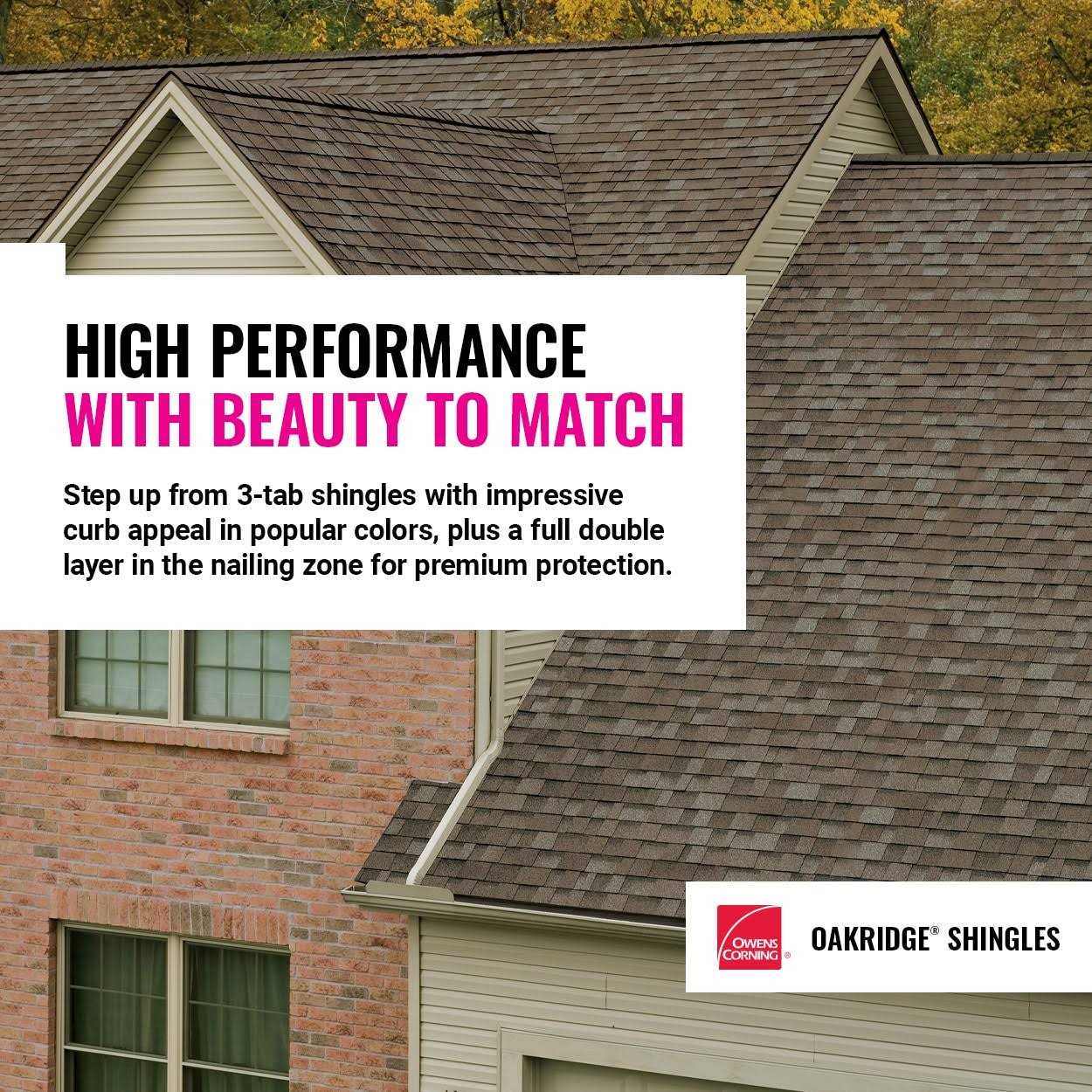 Oakridge laminated shingles are The Right Choice for long-lasting performance. They have a warm, inviting look in a wide range of popular colors for a step up from traditional 3-tab shingles. Use corresponding Owens Corning Hip and Ridge shingles to best complement the shingle color on your home. Color: Driftwood.