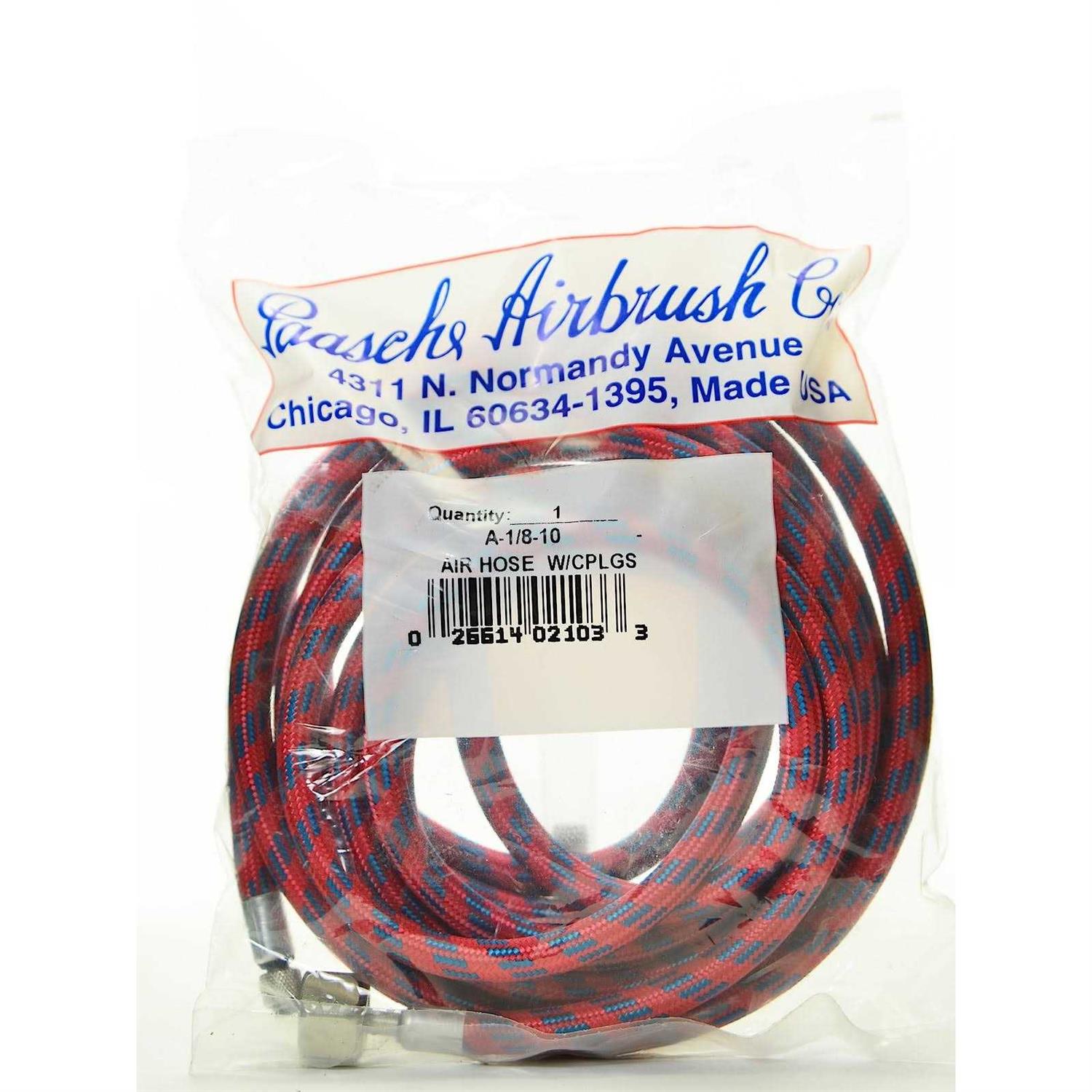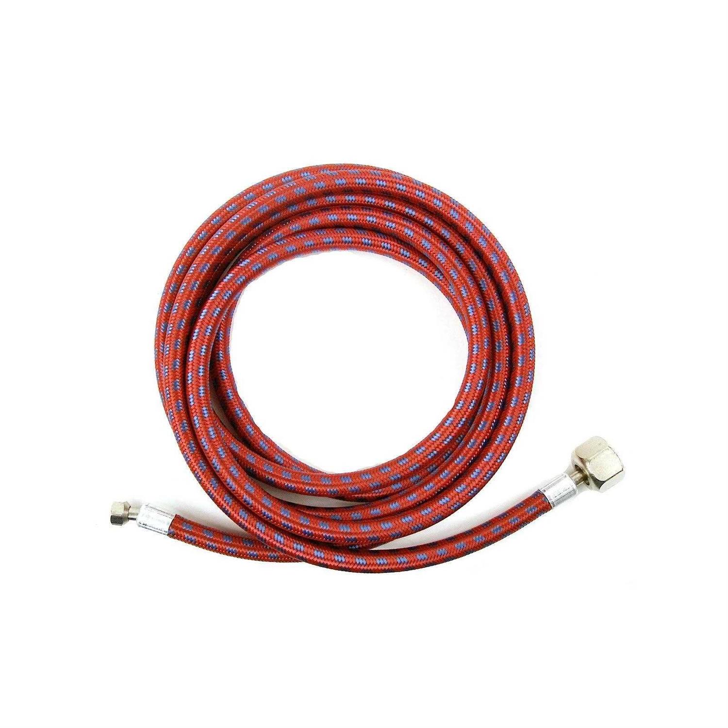 Constructed for durability this brightly coloured braid over plastic tubing is the ideal air hose for use with all Paasche airbrushes. 10 ft Braided air hose with couplings. The coupling at the airbrush end is fitted with an O-Ring to prevent air leaks. 100 psi maximum. Has 1/4 NPT fitting on compressor end.