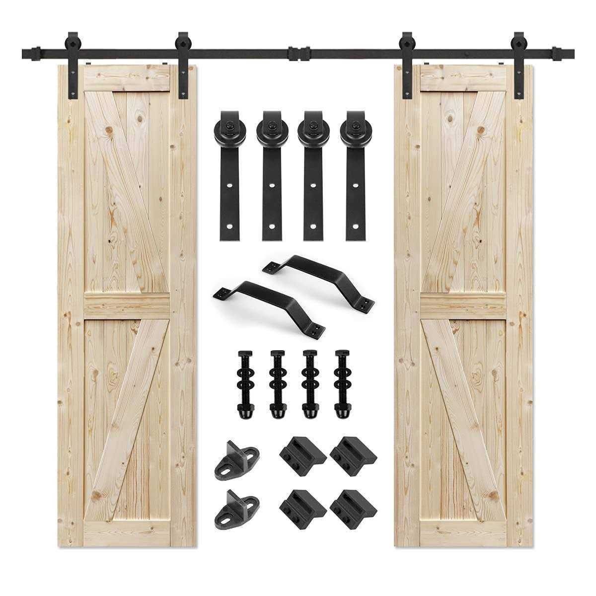S&Z TOPHAND 24 in. x 84 in. Double Unfinished British Brace Knotty Barn Door with 8ft Sliding Door Hardware Kit/Solid Wood/Sliding Door/Double