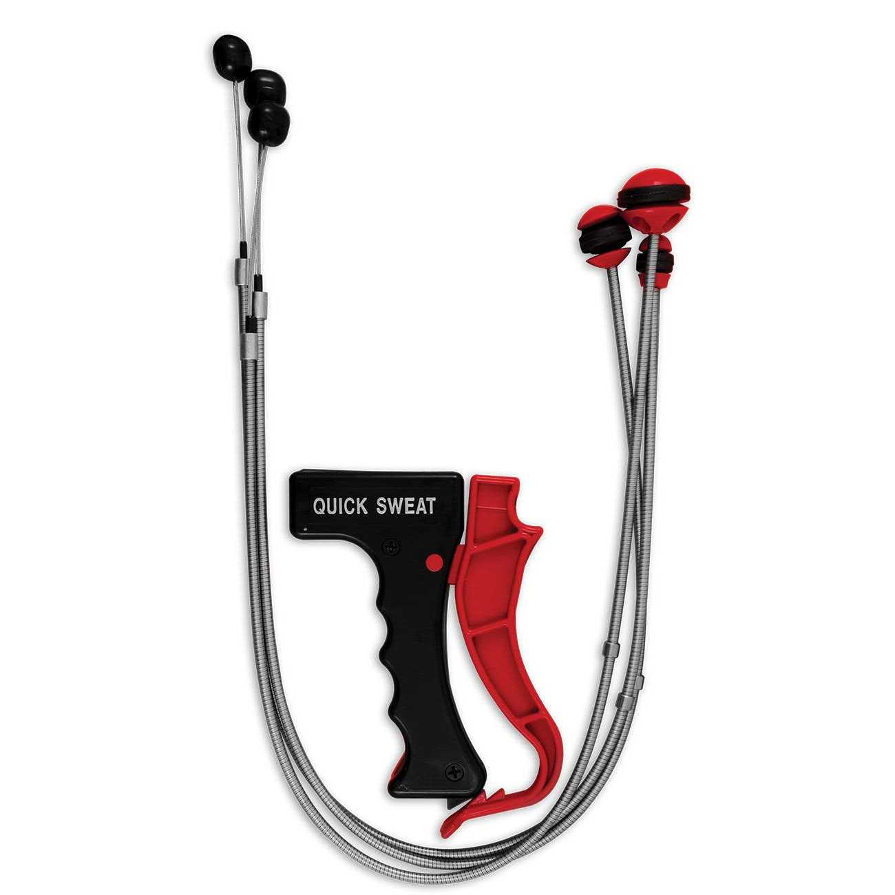 The Quick Sweat Tool is designed to help stop that pesky drip when soldering. First prepare the fitting or full port valve that you wish to solder, as well as, the pipe. Then, slip the 24″ flexible cable thru the fitting or full port valve and into the pipe up to the indicator. Squeeze the handle and begin soldering. Let the pipe & fitting cool, release the Quick Sweat handle & remove the tool. This tool is meant to stop a slight drip. It will not hold back water under pressure. Kit comes with 1/2″, 3/4″, and 1″ Quick Sweat Cables. Other sizes available seperately.