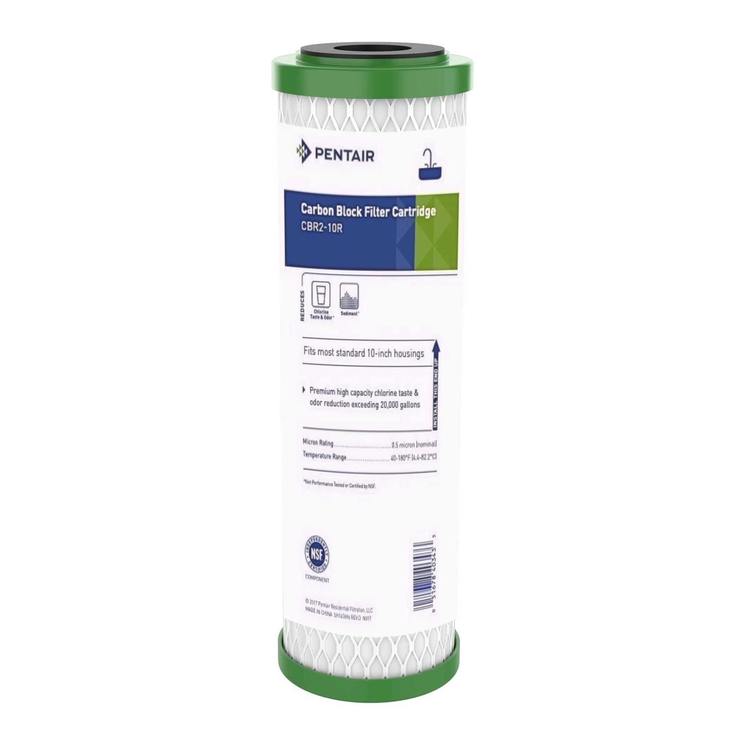 This Pentek CBR2-10 carbon filter cartridge reduces protozoan cysts, chlorine taste and odor, lead, mercury, methyl tertiary butyl ether (MTBE), volatile organic compounds (VOCs), and fine sediment in residential drinking water. It has a nominal (85%) filtration rating of 0.5 micron, and 99.95% efficiency for the reduction of protozoan cysts. It will reduce free available chlorine (FAC) at 2 PPM by at least 75% in up to 20,000 Gal. at a flow rate of 1 GPM. This cartridge is made of bonded powdered activated carbon (PAC) filter media wrapped in a polyolefin pre-filter. The nitrile butadiene rubber (Buna-N) gaskets seal the cartridge against the housing (sold separately). The cartridge operates over a temperature range of 40 to 165°F (4.4 to 74°C). This filter cartridge meets National Sanitation Foundation/American National Standards Institute (NSF/ANSI) standard 42 for quality assurance, and is for purification of residential drinking water in under-sink installations. Nominal filtration rating 0.5 micron Removal of protozoan cysts 99.95% Chlorine reduction 20,000 Gal. at 1 GPM Lead and mercury reduction 2,000 Gal. at 0.6 GPM VOC reduction 600 Gal. at 0.6 GPM MTBE reduction 500 Gal. at 0.6 GPM. Operating temperature range 40 to 165°F (4.4 to 74°C). Materials certification NSF/ANSI standard 42.