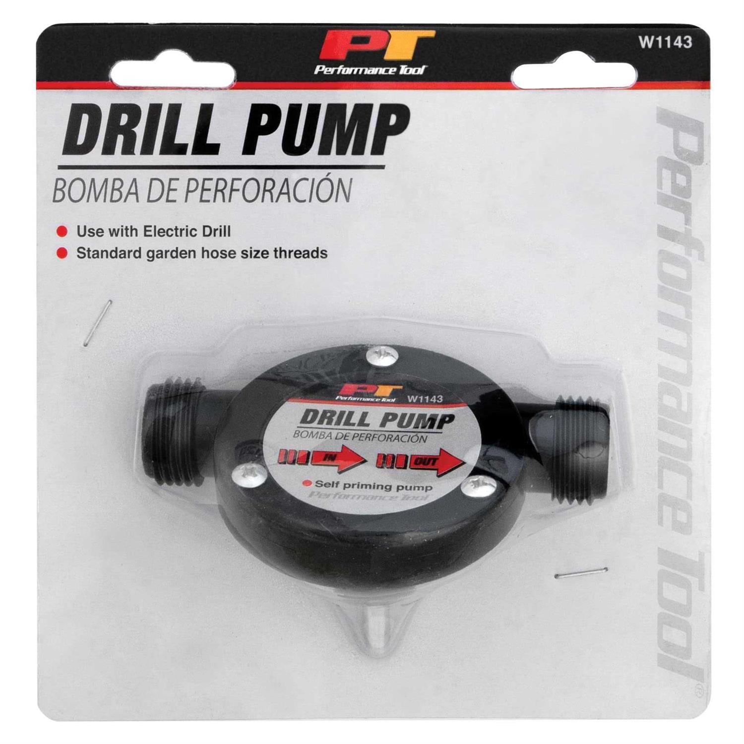 The Performance Tool Drill Pump is ideal for transferring liquids in a variety of applications. Used in combination with a corded or cordless drill and standard garden hoses. Minimum drill speed 12000 RPM gives a water lift of 3.28-feet, and 225 gallons per hour.
