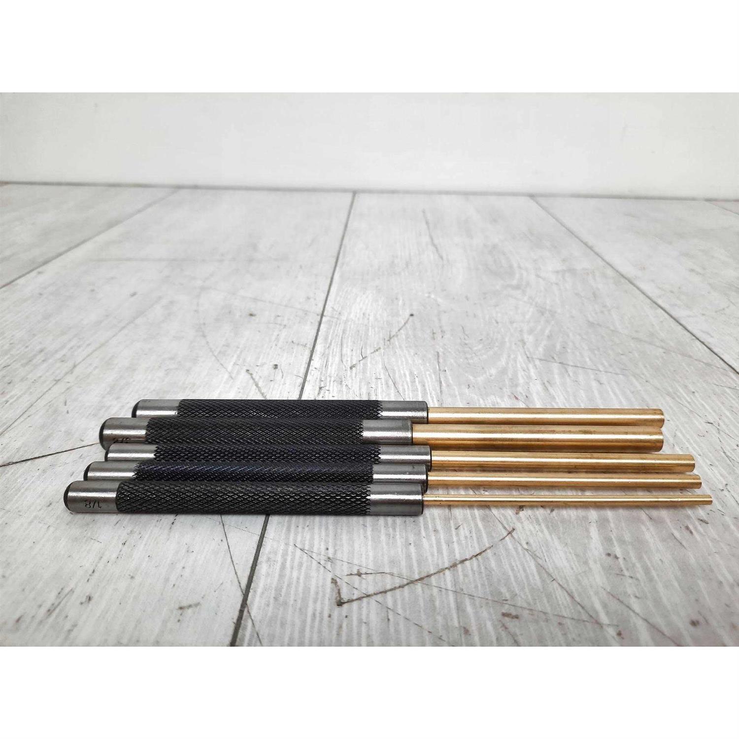 Brass Pin Punch Set features 8in. long shafts to reach deeply set pins in obstructed areas. Solid brass striking heads are designed for soft metal and non-sparking applications. 8in. long to reach deeply set pins in obstructed areas Solid brass striking heads for soft metal and non-sparking applications. Age Group: adult.