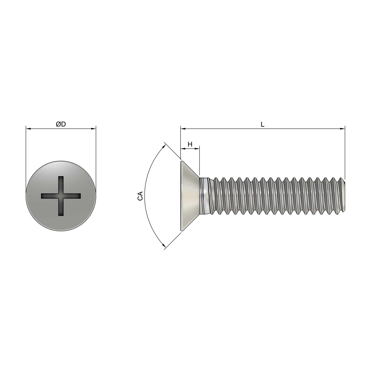 The M3 x 10mm Phillips Countersunk Screws (DIN 965H / EN ISO 7046-2) – Stainless Steel (A2) has the following features:DIN 965H / EN ISO 7046-2 Manufacturing Standard, 10mm Length (L), Stainless Steel (A2) Material, Stainless Steel (A2) Material Specification, 0.5mm Pitch, PH1 Drive Size, Natural Finish, Metric Metric or Imperial?, M3 (3mm) Thread Size, 1.65mm Countersunk Length (H), 90 degrees Countersunk Angle (CA), 5.2mm Head Diameter (Min) (D), 5.6mm Head Diameter (Max) (D), +2/-0 degrees Countersunk Angle (CA) tolerance, /p/35-stainless-steels Material Link, /p/438-natural-finish Finish Link. Discover more about the Metric Phillips Countersunk Screws range. Accu’s Metric Phillips Countersunk Screws are fitted with a standard Phillips head. Phillips heads have been widely used throughout the fastener industry since their invention in 1935. Modern engineers may argue that more recent drive types such as Pozi & Torx offer superior torque and less cam out. If you’d like to investigate these modern drive types, please visit our parent countersunk screw category. Materials Phillips Countersunk Screws can be manufactured in a range of materials, including Stainless Steel, Aluminium, Brass, and Phosphor Bronze. Specialist thermoplastics such as PEEK, Polyamide, Polycarbonate and Nylon are also available. Additional finishes, such as Chemical Blackening and Thread Locking Patches, can be applied to Stainless Steel components on request. Metric Accu’s Phillips Countersunk Screws are manufactured in accordance with DIN 7985H, and are available as standard in metric sizes ranging from M1.2 up to M10. Lengths of between 2.00mm and 150.00mm are also available. Imperial Imperial Phillips Countersunk Screws are manufactured to the ANSI Standard B18.6.3. Diameters from #0 up to #6, and lengths of between 1/8 inch and 6 inch are available as standard. Additional sizes can be manufactured on request.