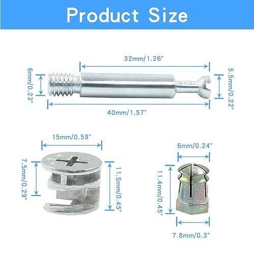Package Included 10 Sets Furniture Connecting Fittings(10 x Cam Fittings + 10 x Dowels + 10 x Pre-Inserted Nuts). UsageFurniture Connecting Cam Fittings can be used for many types of furniture, cabinet, drawer, dresser and so on.. DowelsMale thread diameter: 6 mm/0.23″; Length:40 mm/1.57″,Made of high quality steel, durable and long-lasting.. Cam Fitting12mm x 15mm/ 0.47″ x 0.59″(Dia. *H),Made of zinc, strong rust resistance, exquisite workmanship, sturdy and durable.. Pre-Inserted Nut6mm x 12mm/0.24″ x 0.47″(Inner Dia. *H),made of high quality metal, adopting expansion principle for perfect locking effect..,Hardware > Tools,TUOREN