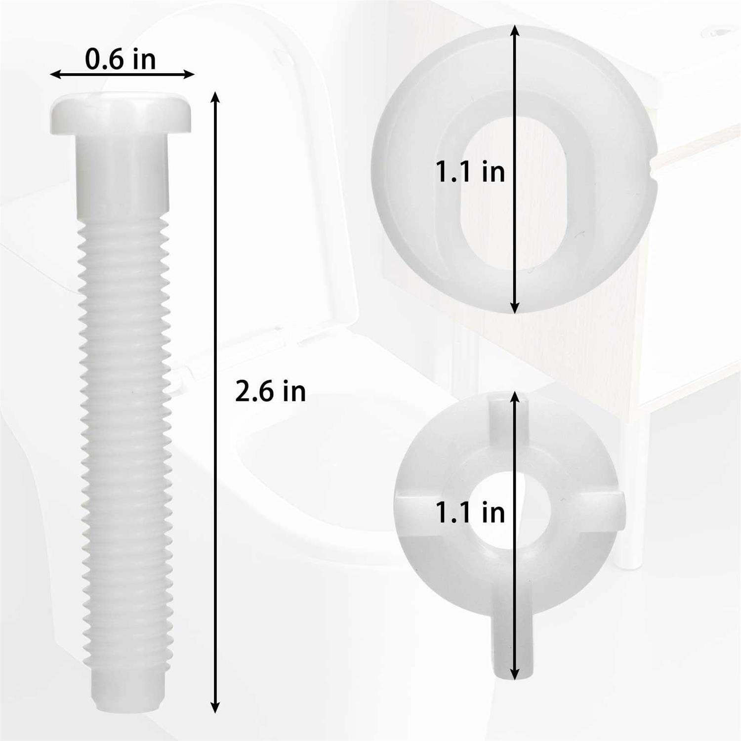 - With the appropriate size, the toilet seat bolts are 2.6 inches in length, 1.1 inches in diameter of the washers, fitting well for most toilet seats.
