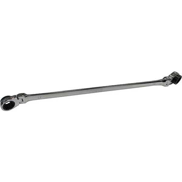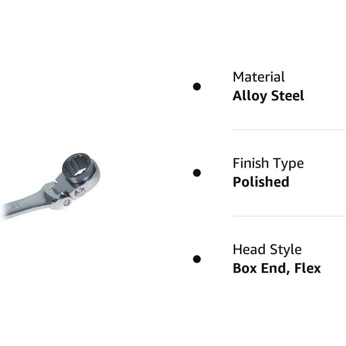 New Offset box end gear provides more surface contact and access to recessed fasteners 72-tooth ratcheting system for high torque & 5 swing Arc for operation in tight areas. Sliding Switch button for quick change ratcheting direction 180 Flex feature & extra long reach allows access to hard-to-reach places High polished chrome plated chrome vanadium steel for good looks & exceptional strength.