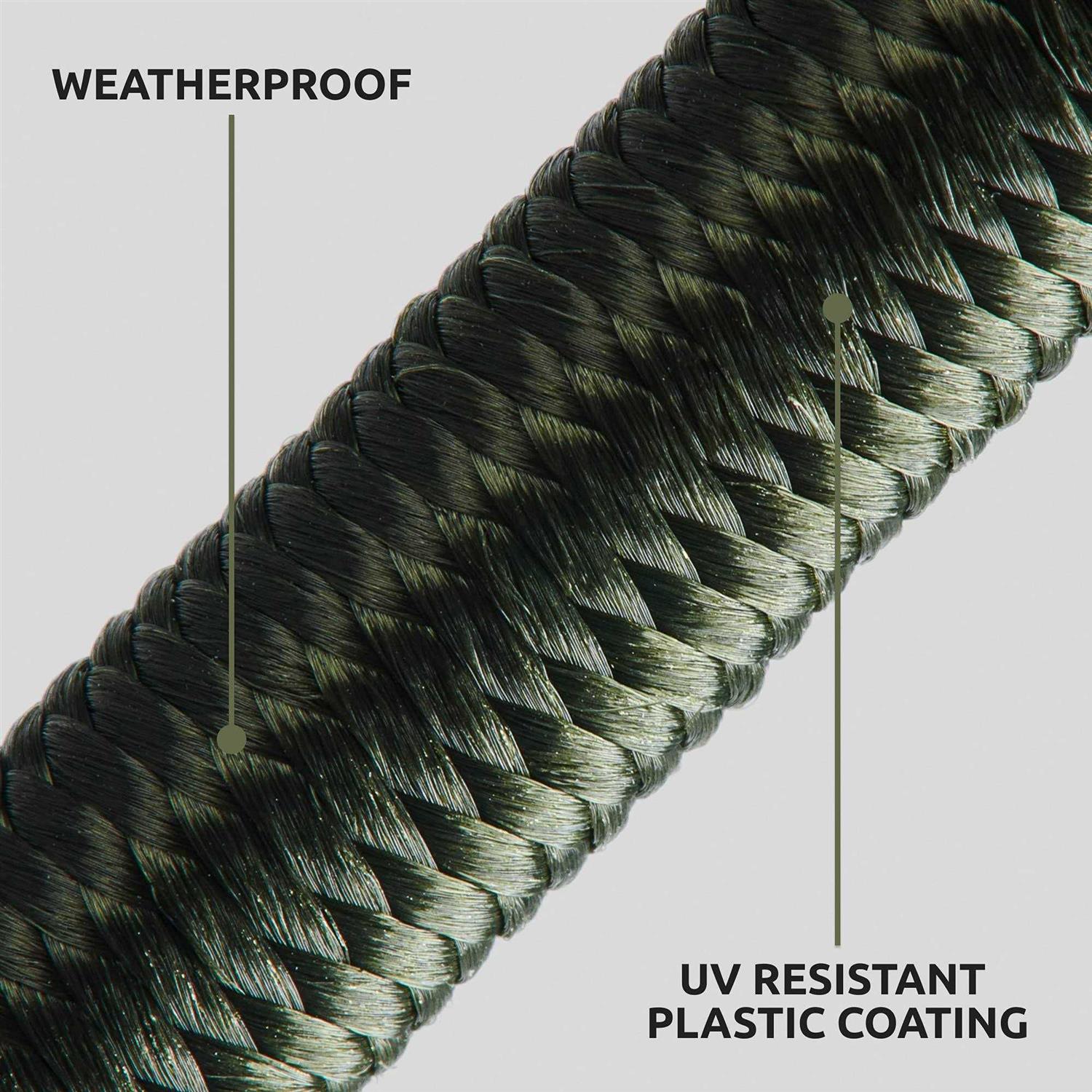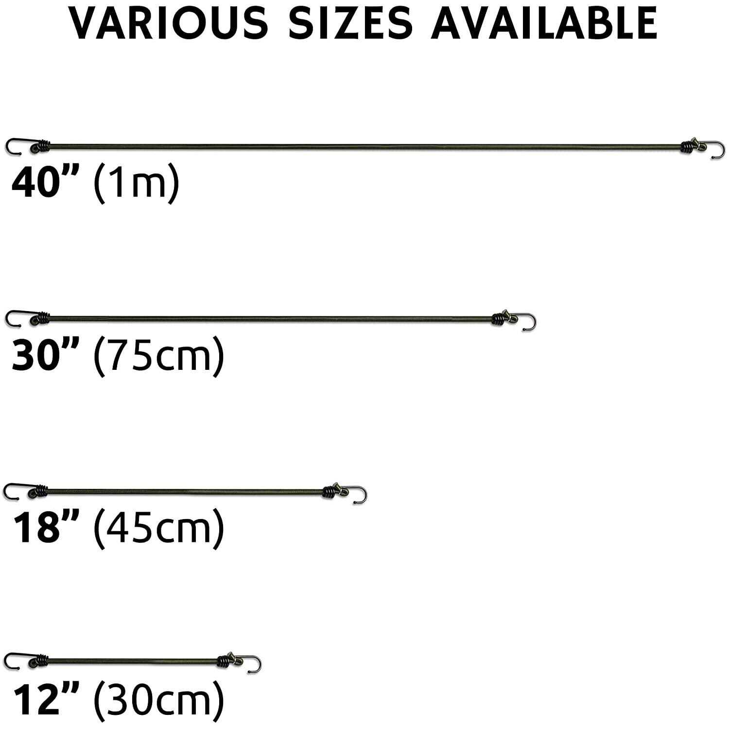DURABLE, DEPENDABLE, SUPER STRONG – Designed to withstand heavy usage, these robust bungy straps with hooks are engineered with an 8mm woven polypropylene cord accompanied by heavy-duty plastic coated steel hooks on either end, which wont bend under loading. HIGH STRETCH TOLERANCE – These elastic bungee straps with hooks stretch to DOUBLE their length and have a maximum load capacity of 30kgs, making them ideal storage straps for strapping, securing, attaching and re-enforcing everything from backpacks to shelter building cover to securing a skip net or barrow cover. ALL WEATHER RELIABILITY- Suitable for all weather conditions and outdoor pursuits, these strong green elastic bungee cord with hooks are reliably element proof and boast real-deal UV resistant plastic coating that wont fade or warp in the sunshine. Perfect elastic straps for cyclists, hikers, DIYers, travel, camping & all outdoor pursuits. Choose from these sizes: 12 (30CM), 18 (45CM), 30 (75CM) and 40 (1M). The elastic strap colour is dark military green, almost black.