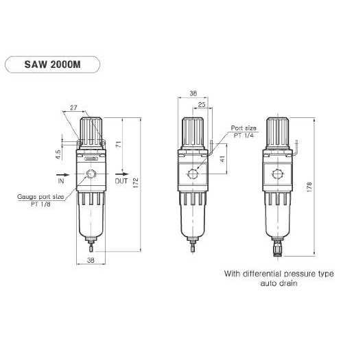 PneumaticPlus SAW2000M-N02BDG Miniature Compressed Air Filter Regulator Combo Piggyback 1/4″ NPT – Poly Bowl, Auto Drain, Bracket, Gauge Feature: 1/4″ National Pipe Thread Taper Piggyback Style Filter Regulator Combo 10 Micron Filter Element, Flow Rate: 28 Scfm Max Supply Pressure: 250 Psi, Max Operating Pressure: 150 Psi Includes 0-150 Psi Pressure Gauge And Bracket Pneumaticplus Saw Series Filter-Regulators, Or “Piggybacks” Combine The Functions Of Both Filter And Regulator. Piggybacks Are Compact And Most Effective When Space Is Constrained. Filter: Filtering Out Of Dirt And Foreign Particles, And The Separation Of Moisture Is Automatic With Air Flow. There Are No Moving Parts And No Adjustments Are Necessary. Accumulated Sludge And Moisture Should Be Drained Off. Sediment Should Not Be Permitted To Fill Above The Lower Baffle. Wash Filter Element At Intervals With Methylene Chloride Or Similar Cleansing Fluid To Maintain Filtering Efficiency. To Clean Element, Depressurize System, Pull Down The Lock And Twist Off The Metal Guard And Polycarbonate Bowl And Unscrew Element From Head. Dry Filter Element Thoroughly Before Reassembling. Clean Filter Bowl(S) Only With Soapy Water. Inspect O-Ring, Replacing If Damaged Or Distorted. Reassemble With Care To Avoid Stripping Threads On Bowl. After A Metal Bowl With Sight Is Tightened, It May Be Rotated Up To 180° (For Proper Viewing.) Regulator: Before Supplying The Air, Turn The Adjusting Knob Counter-Clockwise Until Compression Is Released From The Control Spring. Turn On The Air Supply And Adjust The Knob To Set The Desired Secondary Pressure By Turning The Knob Clockwise. Note: Adjustment Knob Must Be Pulled Away From The Body Of The Regulator To Operate. After Desired Secondary Pressure Is Set, Pushing The Knob Back Towards The Body Will Lock The Control Knob. Important: Use Care To Avoid Screwing Fittings Too Far Into Body Of Units As It May Close Internal Ports. Normally Finger Tight Plus One Turn Will Seal. Bowl (Metal Or Polycarbonate) And Drain (Auto Or Manual) Options Available.