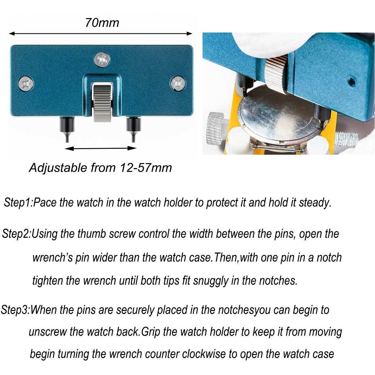 - The watch case opener tool is made of hard steel material,with adjustable tempered tips that adjust from 12 mm to 57 mm.