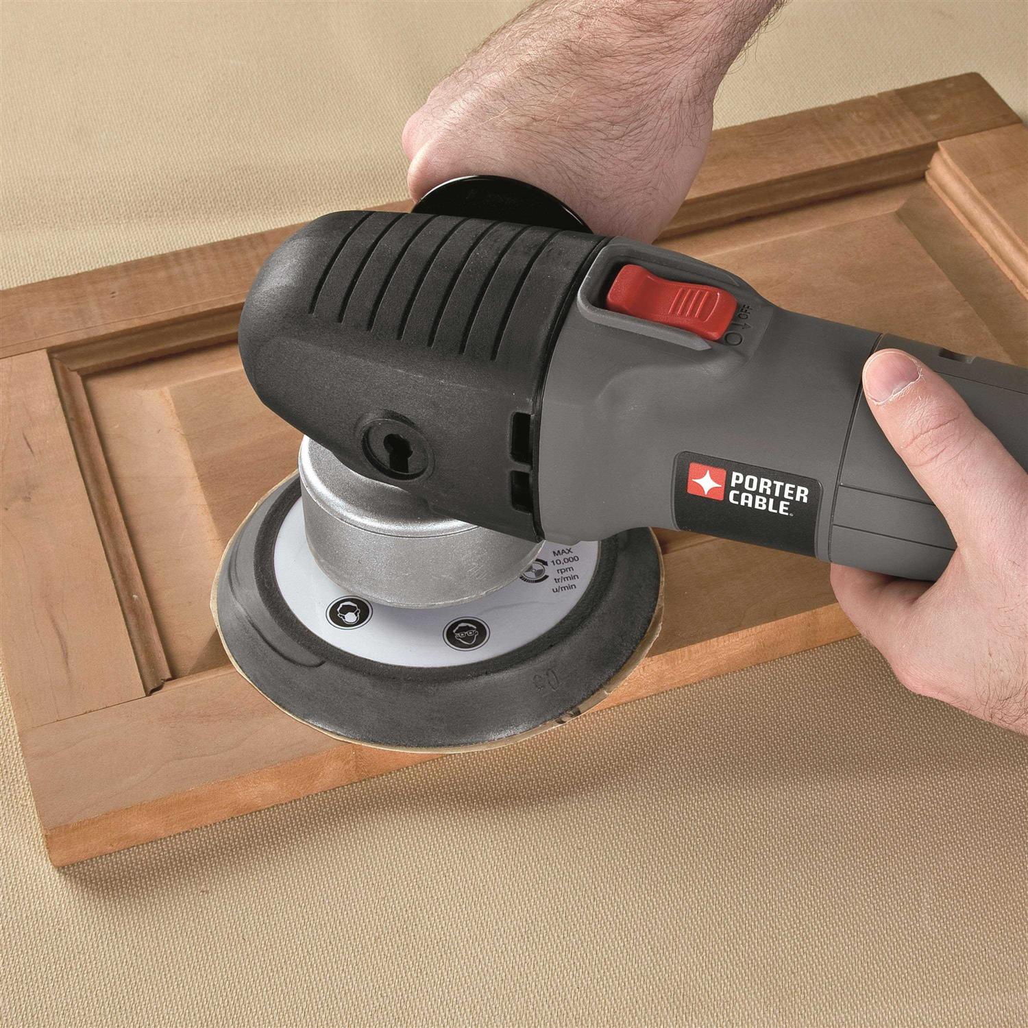 Give large, flat wood surfaces a swirl-free finish with the 6-Inch Variable-Speed Random Orbit Sander from Porter-Cable. Its 4.5-Amp variable-speed motor gives you aggressive and fine options at 2500 to 6800 orbits per minute. The rear-grip variable-speed thumb wheel on the Porter-Cable 6-inch variable-speed random orbit sander provides convenient, on-the-fly speed control. The sanding pad attaches to a spindle with 5/16-24 threading and accepts PSA discs. The Porter-Cable right-angle random orbit sander has a polishing pad that attaches to the spindle with a spacer that lets the pad move freely. The sander has excellent balance. The Porter-Cable electric random orbit sander is compact, has generous palm-pressure placement and comes with a handle that attaches to either side of the housing at a 90-degree angle.
