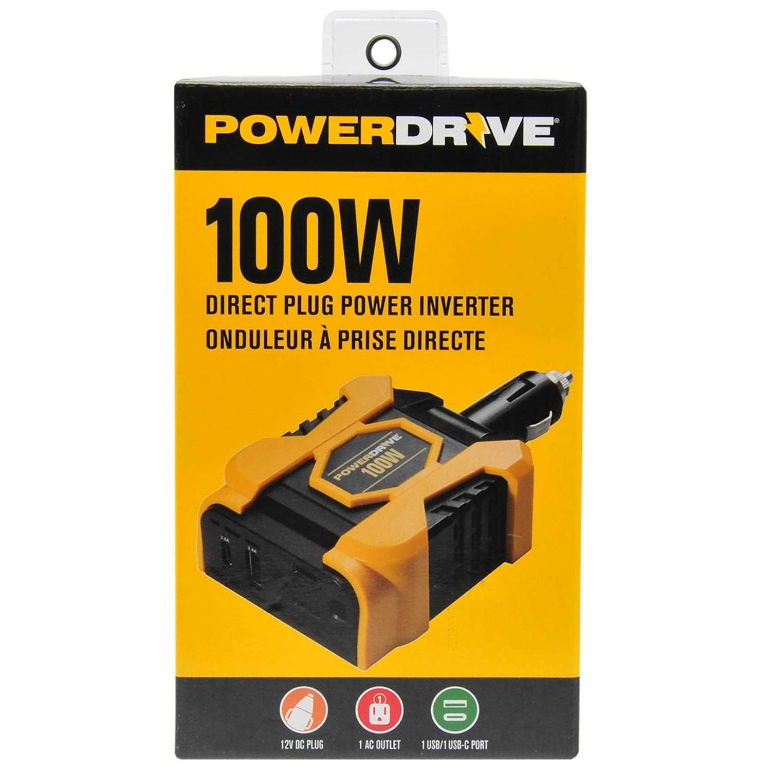 PowerDrive delivers powerful, mobile, convenient power supply solutions that convert your vehicle’s battery power (DC) to household power (AC), keeping your devices powered and you on the go. The powerful PD100D Power Inverter supports AC devices rated up to 100-Watt delivering 100-Watt of continuous AC power. This mobile-friendly unit plugs into a 12-Volt port for easy portability. Reliable safety features include overload shut-off triggers. Design-savvy styling of the inverter’s housing includes an illuminating glow to reinforce that power is active. The durable ABS PVC composite housing is tough and rigid to protect electronic components from abrasion and damage.