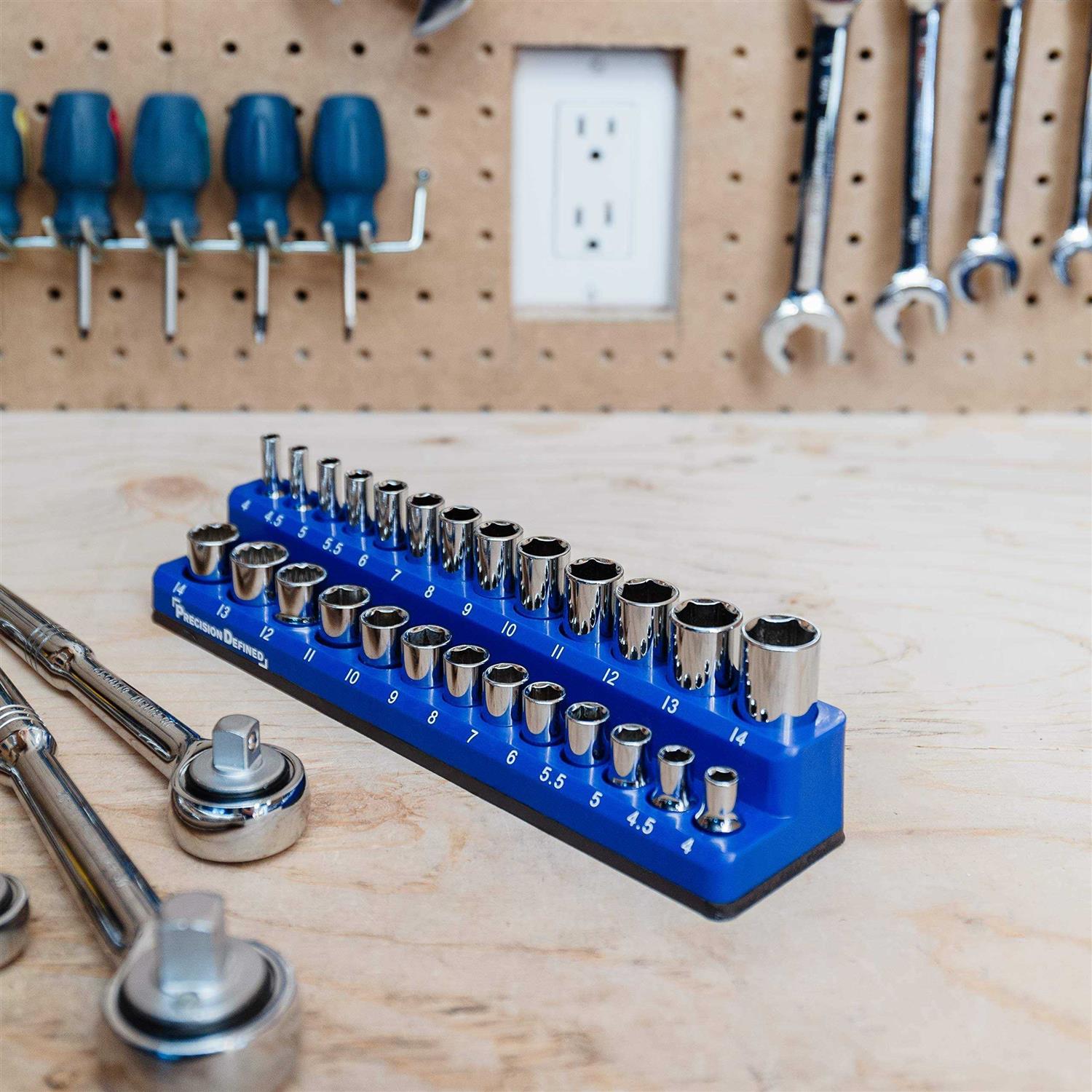Precision Defined Magnetic Tool Socket Organizer Holder, Metric, 26 Sockets (1/4-Inch Drive (Metric), Blue)