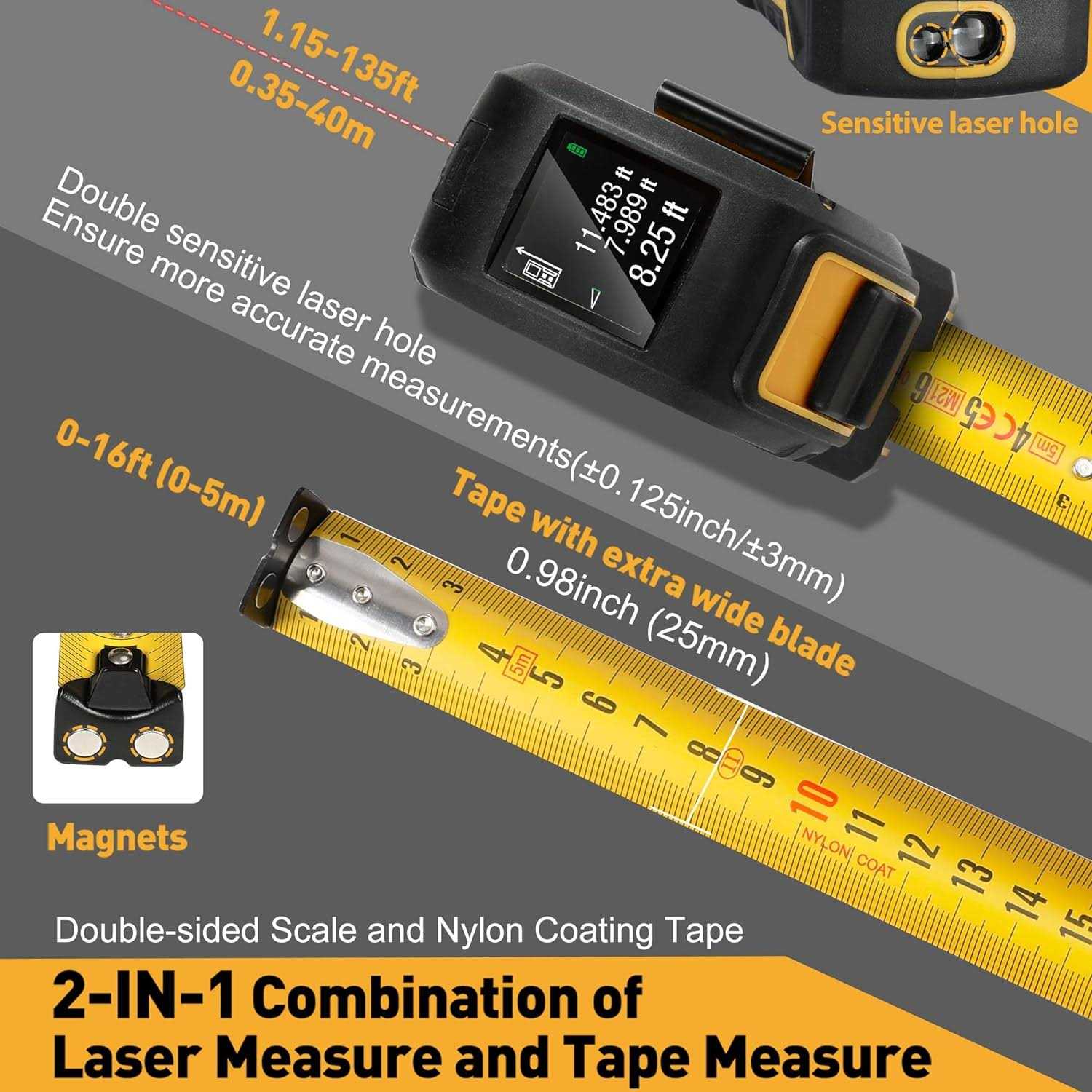PREXISO 2-in-1 Laser Tape Measure 135Ft Rechargeable Measurement Tool & 16Ft Measuring Movable Magnetic Hook