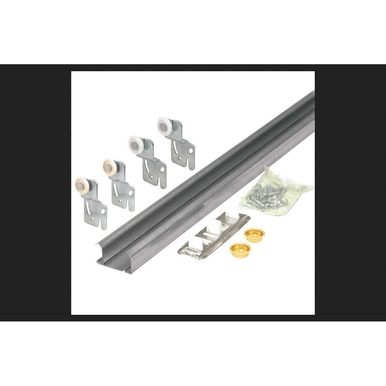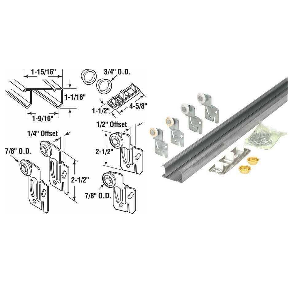 Pocket & Bifold Door Hardware by Slide-Co. Details:This by-pass closet door track kit is constructed of a galvanized track, with other steel and plastic components. It features double-J tracks for the installation of a 2-door panel system. The track length is pre-cut to 47-in. to minimize the need for cutting, and it is commonly used with wooden door panels measuring from 3/4 inch thick to 1-1/4 inch thick. Each kit includes an adjustable bottom guide (constructed of a steel base with adjustable plastic tips), brass-plated stamped-steel finger pulls and installation instructions. This kit will safely hold doors that weigh up to 60 pounds each.