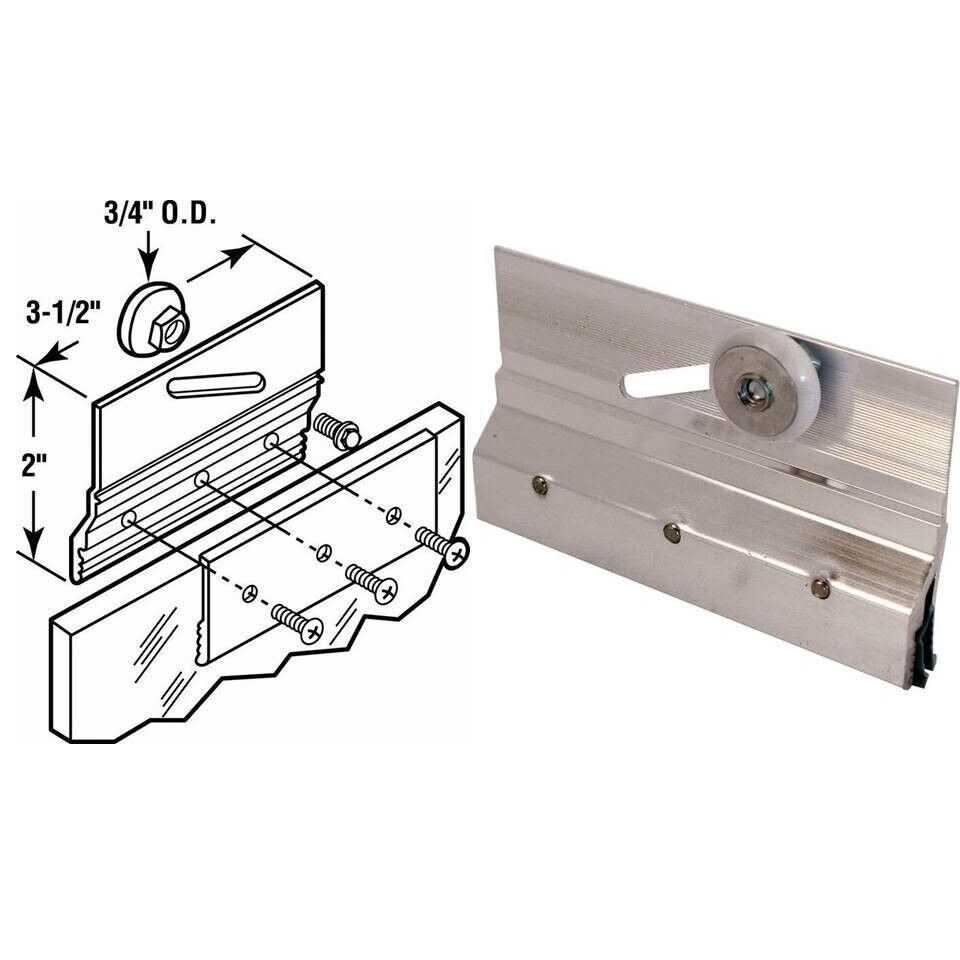 This is a tub and shower door roller assembly used on frameless glass shower doors. It has an oval edged 3/4 in. nylon ball bearing roller attached to a two piece chrome aluminum bracket. This two piece assembly clamps onto the top of the shower door glass with a vinyl glazing gasket. It will fit up to 1/4 in. thick glass. The nylon roller height is adjustable by sliding the roller up or down in the diagonal mounting slot and then tightening.
