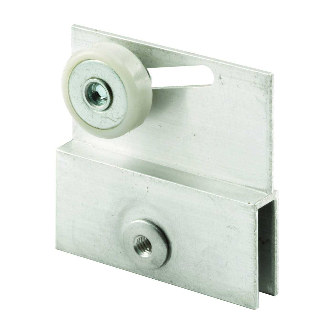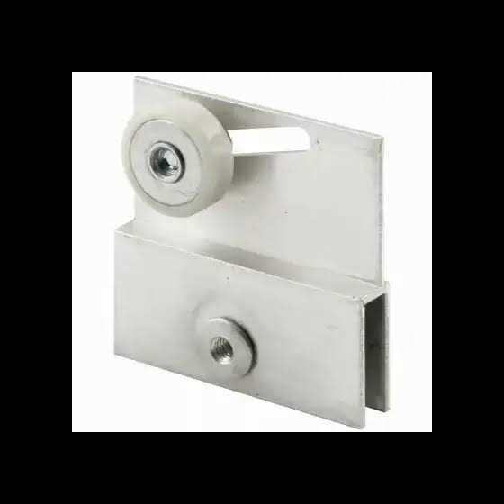 This shower door roller assembly is constructed of extruded aluminum and comes in a milled aluminum finish. It features a thru-glass binder post & screw for fastening the bracket to the top of the glass on frameless sliding shower door systems. The wheel is constructed of plastic; it features a flat edge and steel ball bearings for long-lasting, smooth operation. This frameless shower door top roller assembly bracket is used by many shower door manufacturers.