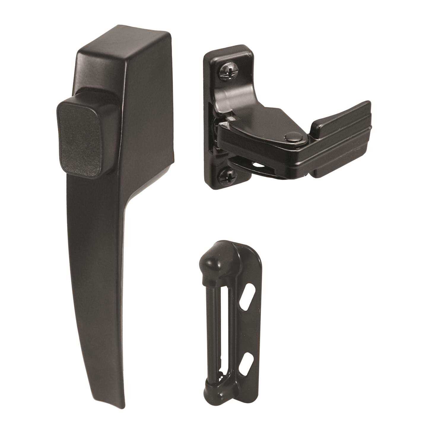 This push button latch comes finished in black. It is designed for use on outswinging wood or metal screen or storm doors. It fits on doors that are 5/8 to 1-1/4 In. thick and comes complete with a night lock.