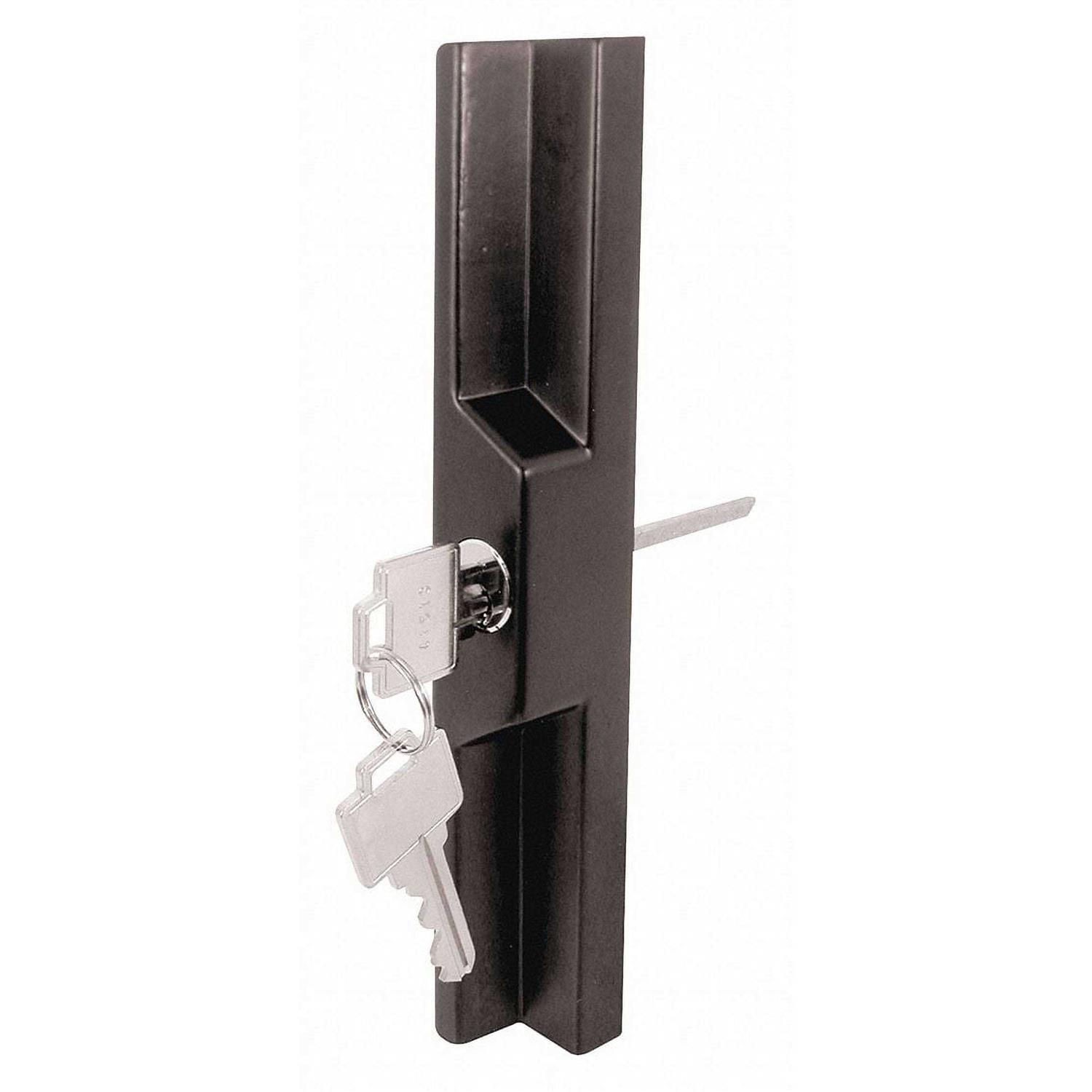 Prime-Line This sliding door handle set is constructed of diecast and it comes finished in a white powder-coated finish. It’s compatible with many mortise-style locks and it is non-handed allowing it to install on both left and right-handed doors. The handle is surface mounted and it has a 4-15/16 in. hole centre spacing. This patio door handle set includes a thumb lever with a safety lock feature. It mounts on the surface of the sliding door framework and is used by many patio door manufacturers. Other items to consider purchasing are the Prime-Line parts E 2000 and E 2563.