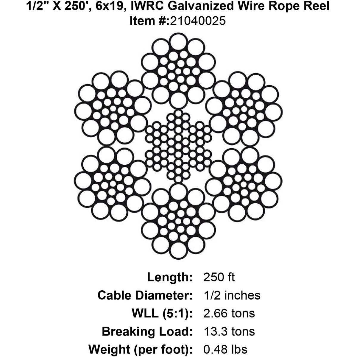 1/2 diameter 6×19 galvanized wire rope. 500 ft reel constructed of 6 strands and 19 wires per strand. – Wires are hot dip galvanized for greater corrosion protection. – A general purpose rope good for winch cables & lifting slings. – Breaking strength is 13.3 tons and working load limit is 2.66 tons. – Rope weighs 0.48 pounds per foot and adheres to federal specification RR-W-410H.
