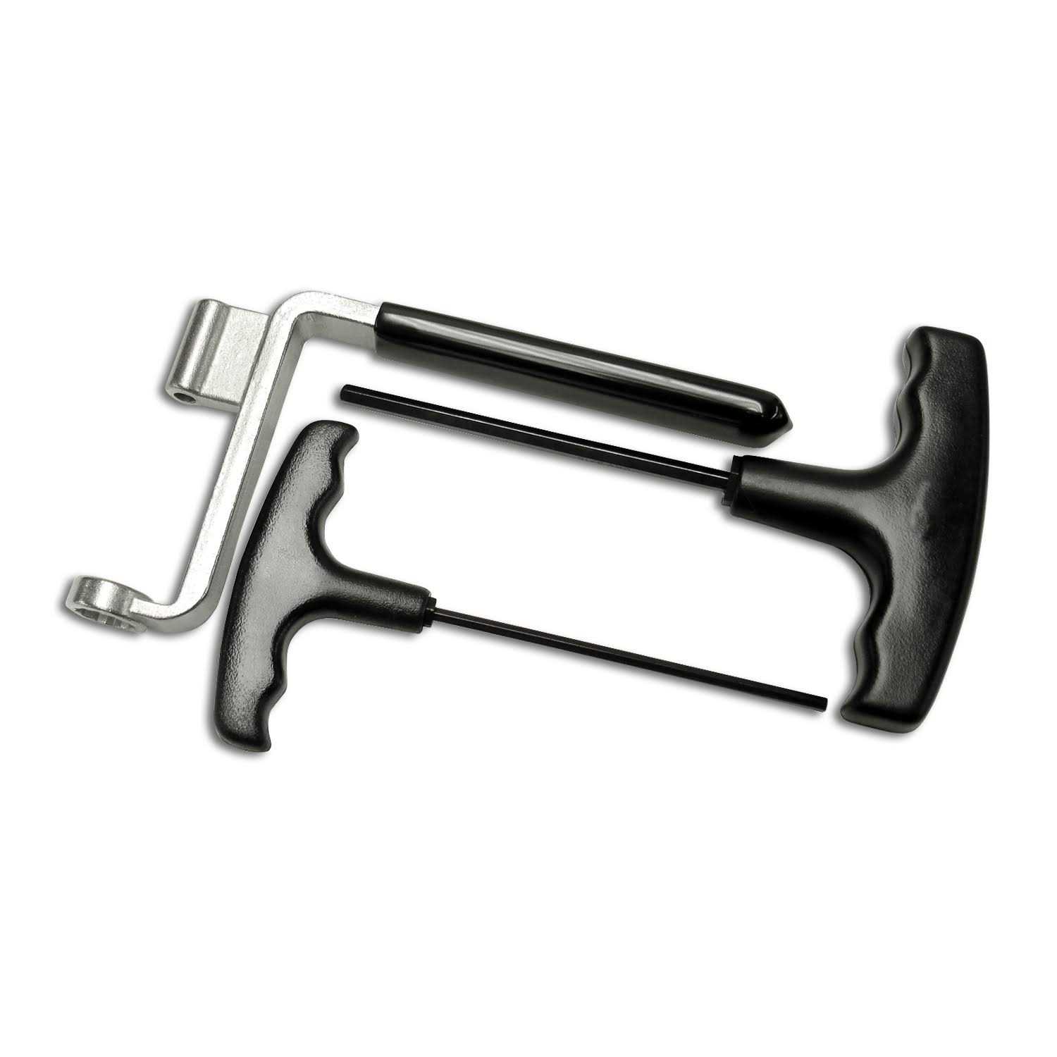 T-Handles. This simple T-handle and wrench set makes adjustment very easy, cutting the adjusting time in half. Simply position the adjusting handle wrench over the rocker arm lock-down (make sure you have purchased the set with the proper sized wrench), and drop the appropriate T-handle down through the hole in the wrench – with one hand doing the job of two! Then make the lash adjustment with a feeler gauge according to the camshaft manufacturer’s specifications.