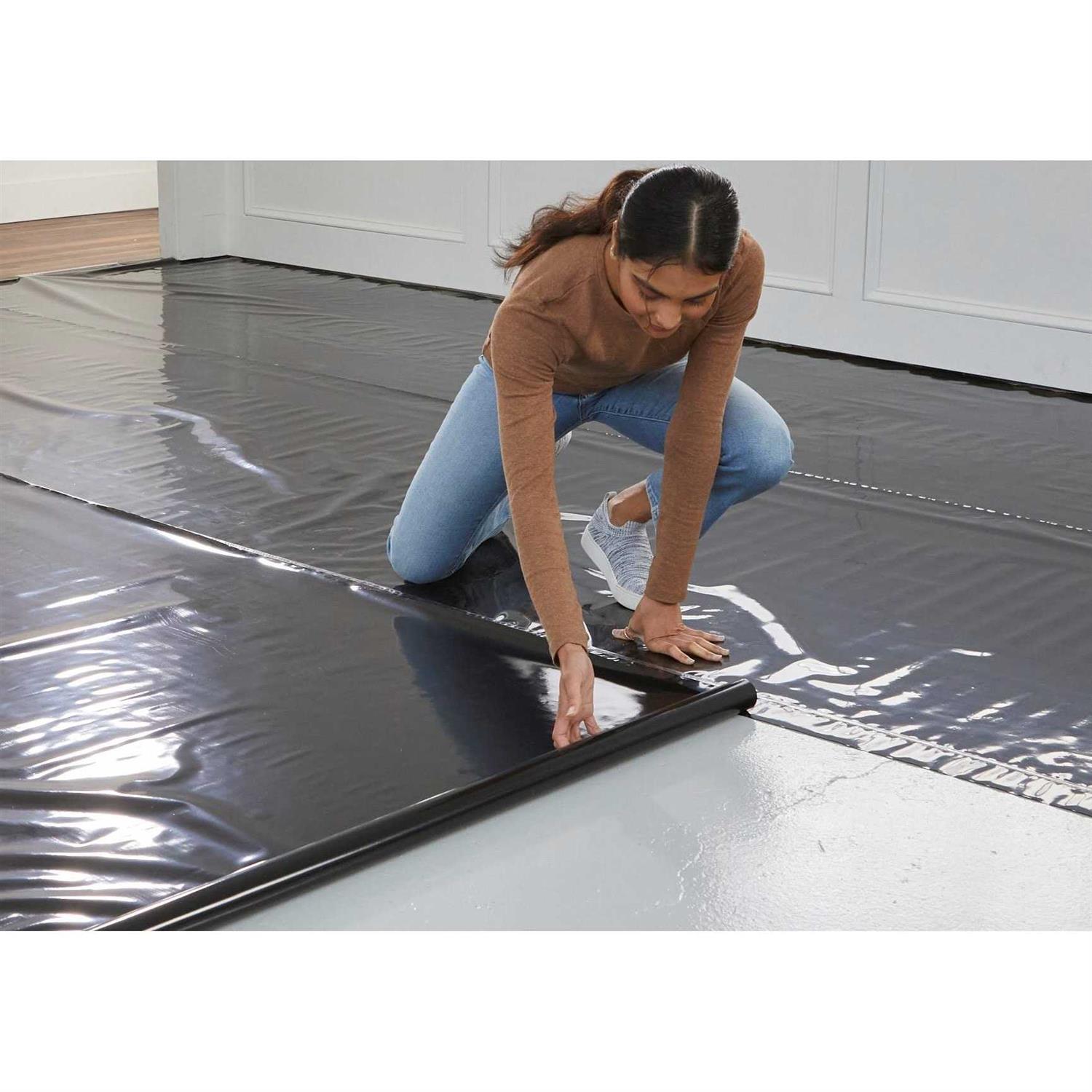Helps protect your floor against moisture. Moisture barrier for concrete sub floors. Easy to seal with built in lip and tape. 100 sqft coverage area. Made in USA. Helps protect your floor against moisture. Moisture barrier for concrete sub floors. Easy to seal with built in lip and tape. 100 sqft coverage area. Made in USA.