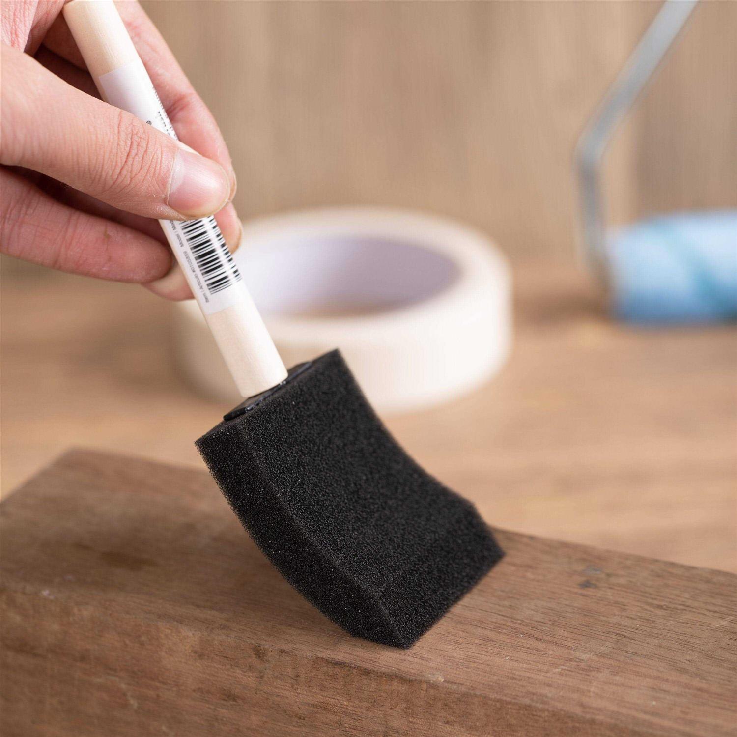 Can be used latex paints and acrylic. Ideal for crafts, hobby paints, small projects, and touch ups. Made of high-density foam brush for better paint absorption. Chiseled foam brush head allows for easy use. Solid wood handle. Disposable.
