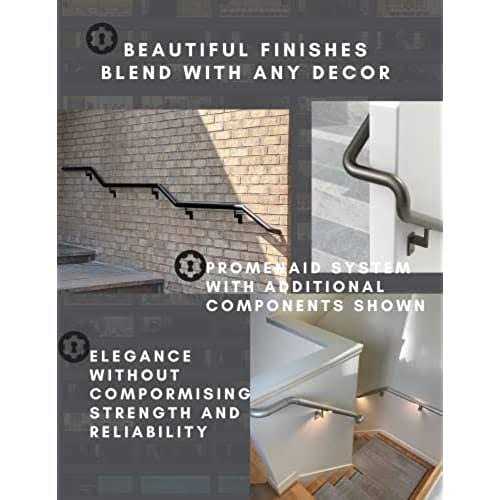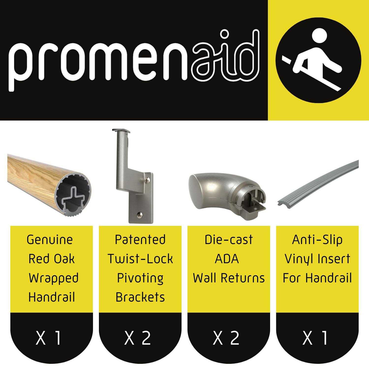 Easy to Install Indoor Railing – Indoor, zero maintenance, ready to install. Modular handrail components and simple mounting technology allow Promenaid handrails to be installed quickly and easily by anyone with no special tools or training. Promenaid handrails connect like building blocks, so installation is quick, easy and strong. Durable Finish – Elegant Red Oak bonded to aluminum core handrail finish and champagne silver hardware; Never flake or chip Building Code and ADA Compliant – Meets all requirements of the Americans with Disabilities Act (ADA) , Accessibility Guidelines throughout North America and all Residential and Commercial strength building codes Simple Twist – Lock brackets clip in anywhere on the railing to always align with studs, pivot to match any stair slope and support 500 lbs. each. Add, remove or reposition them anytime in seconds. No drilling required Our innovative handrails and grab bars can be installed anywhere. Stairs and stairwells, ramps, baths & showers. Drywall, brick wall, no wall at all. Glass. Tile. Around obstructions and funky angles. And Promenaid can do it