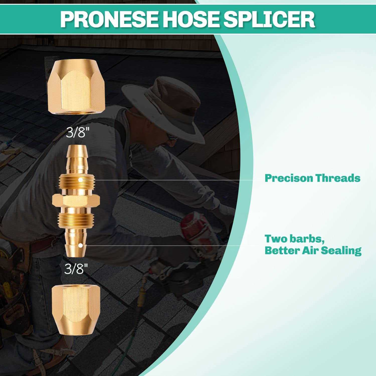 Fittings by Pronese. Details: Specification: 1. Easy to disassemble no flaring tool required. 2. This fitting is made of brass for corrosion resistance, ductility at high temperatures, and low magnetic permeability. 3. Fitting body and 2 nuts for splicing damaged hose. 4. Very easliy to install. Package includes: 4Pack 3/8 inch x 3/8 inch Hose Splicer with 1pcs teflon tape. Fits: Suitable for plastic air hoses such as PU PVC, 1/4″ barb can work for 1/4″ID x 3/8″ OD(10×6.4mm) hose or 5/16″ID x 15/32″OD(12x8mm) hose. If your air hose is rubber,please check the size befor buying! Suitable for plastic air hoses such as PU PVC, 3/8″ barb can work for 3/8″ID x 1/2″ OD or 9/16″OD (14x10mm) hose. If your air hose is rubber,please check the size befor buying!