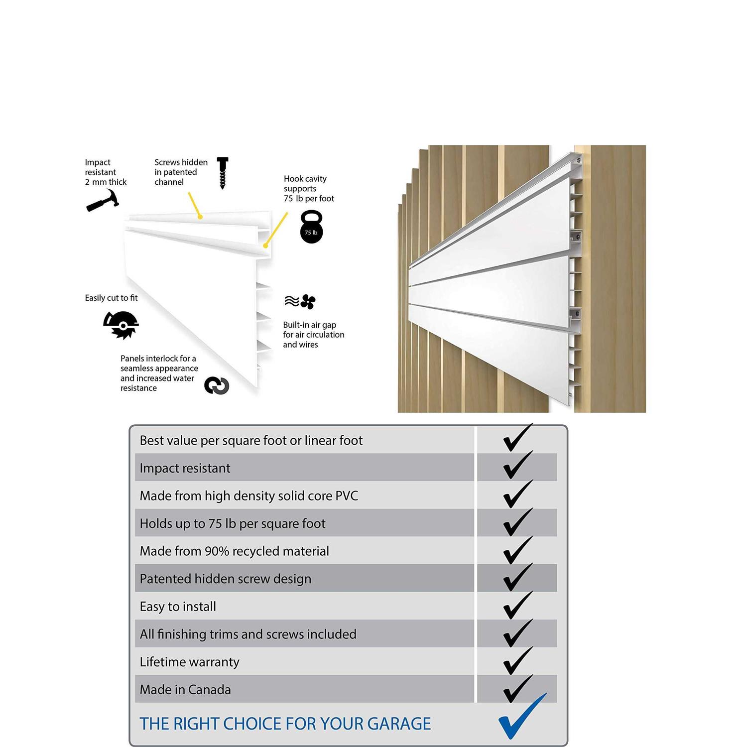 Included in this kit are 10 in. x 8 in. panels assembled equals 4 in. high by 8 in. wideplus all necessary trims andmounting screws. Made in Canada from 90%25 recycled material Proslat is one of the greenest storage solutions on the market. It is also one of the most versatile as individual panels may be installed as a track in a section or over an entire wall. Installation is simple and the unique hidden screw design provides a professional finish. Built to last Proslat wall panels are up to 25 times more impact resistant than drywall and hold up to 75 lb. 34 kg per linear ft.