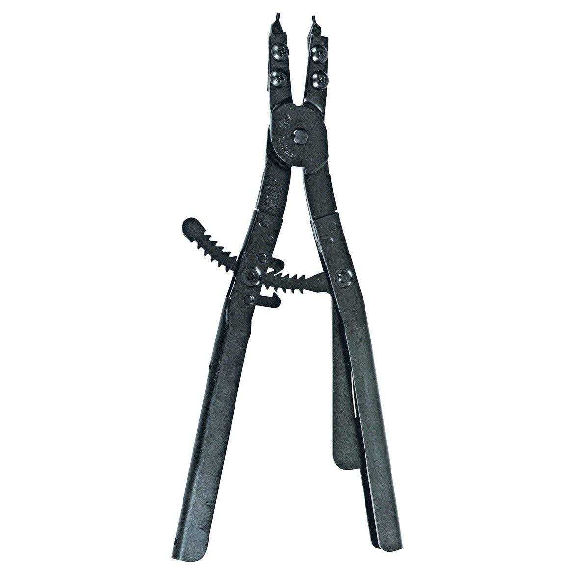 Stanley J364 Proto Large Retaining Ring Pliers – Internal 16-1/2-inch Spring-loaded ratchet mechanism minimizes operator fatigue by allowing the ring to be compressed or expanded through gradual -inch moves and then locks at the desired size without continued pressure on the handles. Heavy and large rings are safely and easily controlled. Replaceable tips in 0°, 45° and 90° make it possible to remove and install rings in most applications. (Replacements available). .120 Tip size 16-1/2-inch Length.