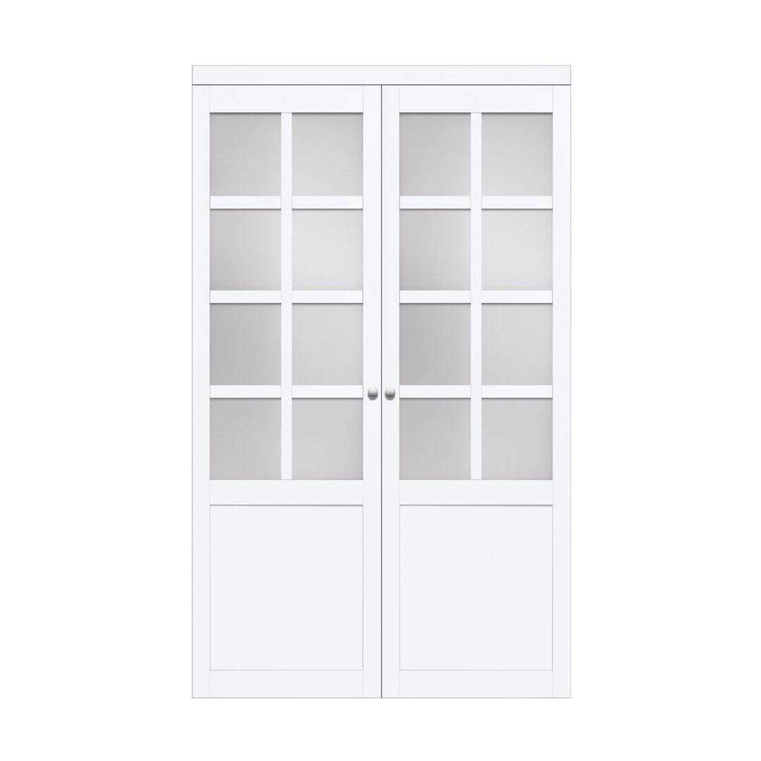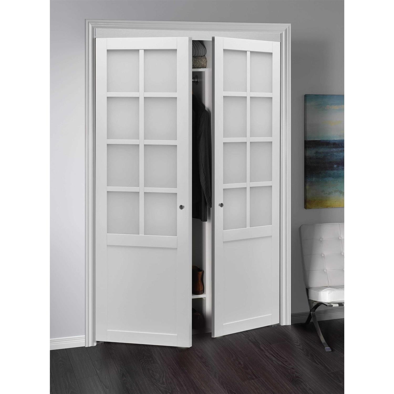 Pre-finished saves time and money with no painting staining or mess to clean up. Durable and easy to clean dcor finish with a matching valance. Super stable engineered wood core which does not crack or warp as a result of humidity changes in the home. Trackless design hazard free opening. 4mm tempered frosted glass design allows for privacy as well as natural light to enter the room. Adjustable top pivot connector for out of square opening and quick door alignment. Includes a set of round knob pulls in satin nickel finish to easily open and close your door. CARB Phase II certified. Can not be painted or stained.