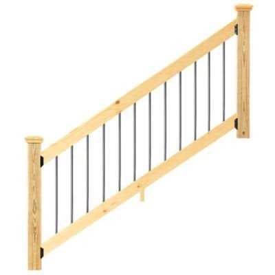 This 6-foot-on-center wood stair railing kit for outdoor stairs comes in a ready-to-build kit, complete with balusters. The square, solid wood balusters have straight ends and are installed between the rails. The rails are molded with rounded edges and cut with a 34-degree angle for easy installation. They’re available in 3 types of wood that resist insects and rot: solid cedar, pressure-treated, or color-treated. Color-treated rails are pressure-treated wood infused with colorant, so you won’t need to stain them. To lock in color, waterproof as needed. To complete your railing, you’ll need posts and post caps, not included. Not recommended for line railings. For straight (horizontal) rails, use models 446318 (redwood tone), 447294 (pressure treated), 448157 (cedar tone), 446445 (walnut tone), or 447172 (cedar).