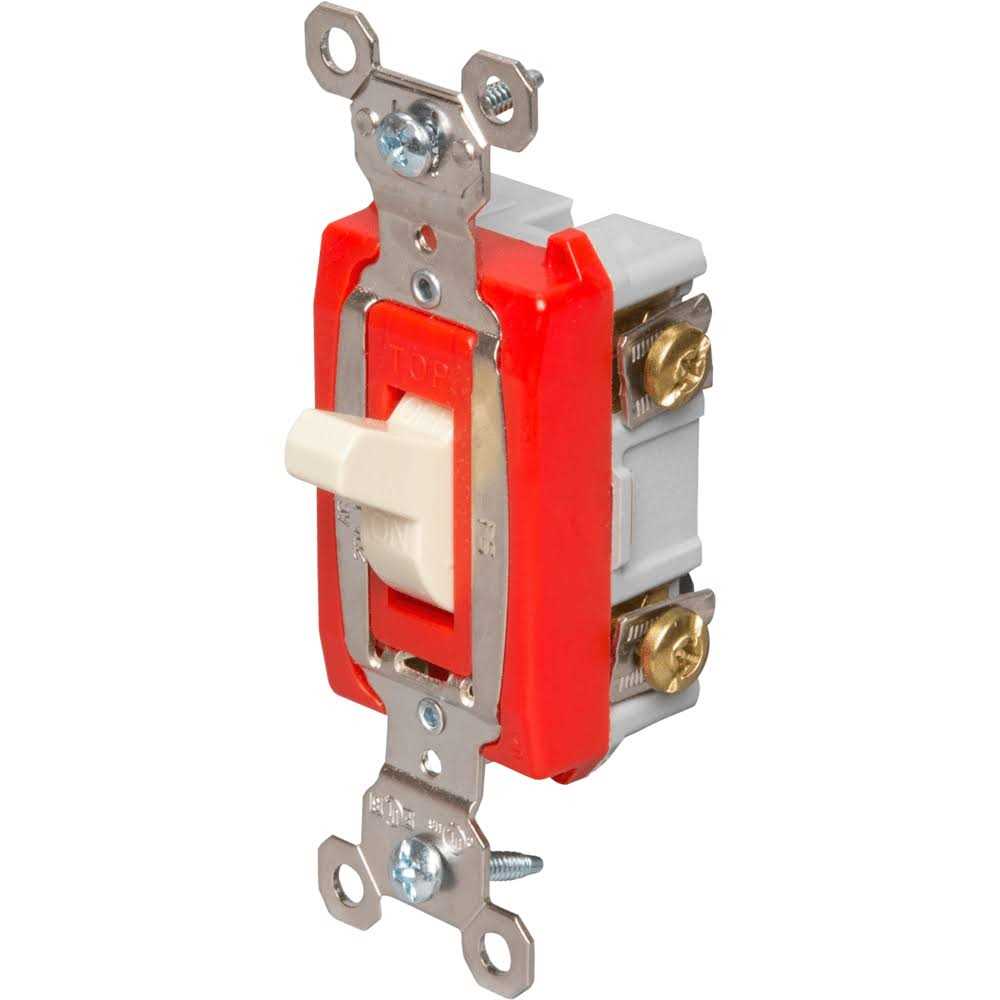 Pass & Seymour Extra heavy-duty toggle switch in ivory color features oversized silver alloy contacts for better heat dissipation and durability. The 1-Pole Lighted switch has high strength thermoplastic polycarbonate toggle. It comes with a heavy-gauge one-piece copper alloy contact arm to virtually eliminate contact bounce. Heavy-duty bumper pads are included for quiet operation. Switch comes with an external screw-pressure-plate and is back/side wired for easy connection. It measures 1.320 Inch x 1.073 Inch x 3.281 Inch. It employs cam mechanism to control fast make and positive break operations with reduced arcing. Switch has a shallow design to provide easy installation. It has a current rating of 20 Amps and a voltage rating of 120/277 Volts. The back body of the switch is made from glass-reinforced nylon. It has an auto-ground clip to ensure positive ground. Locking support offers resistance to face and back body separation. The strap is made from nickel-plated steel with integral ground. Switch accepts 14 – 10 AWG copper or copper-clad conductors.