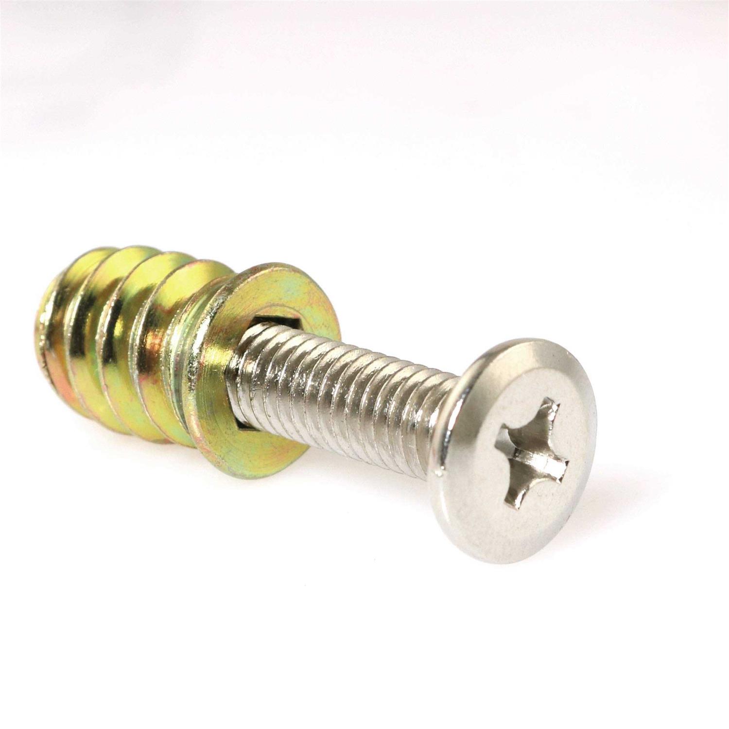 The insert nuts are made of high-quality carbon steel, surface corrosion resistance treatment, durable. The insert nuts are designed with countersunk head and internal hexagon drive. Reverse Thread Flat Head Phillips Screws are Nickel Plated, Bright and beautiful. It is suitable for the fastening of bedside cabinets and furniture. You will receive: 8pcs Insert Nuts + 8pcs Phillips Screws Insert Nut basic info: br Size: M6x15 br Material: carbon steel br Surface treatment: Color zinc Plated br br Phillips Screws basic info: br Size: M6x25 br Surface treatment: Nickel Plated