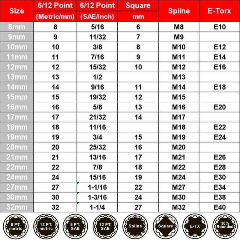 - 12 teeth spline socket, suitable for various fasteners, such as 6 points, 12 points, E-torx, Triangle, square etc.