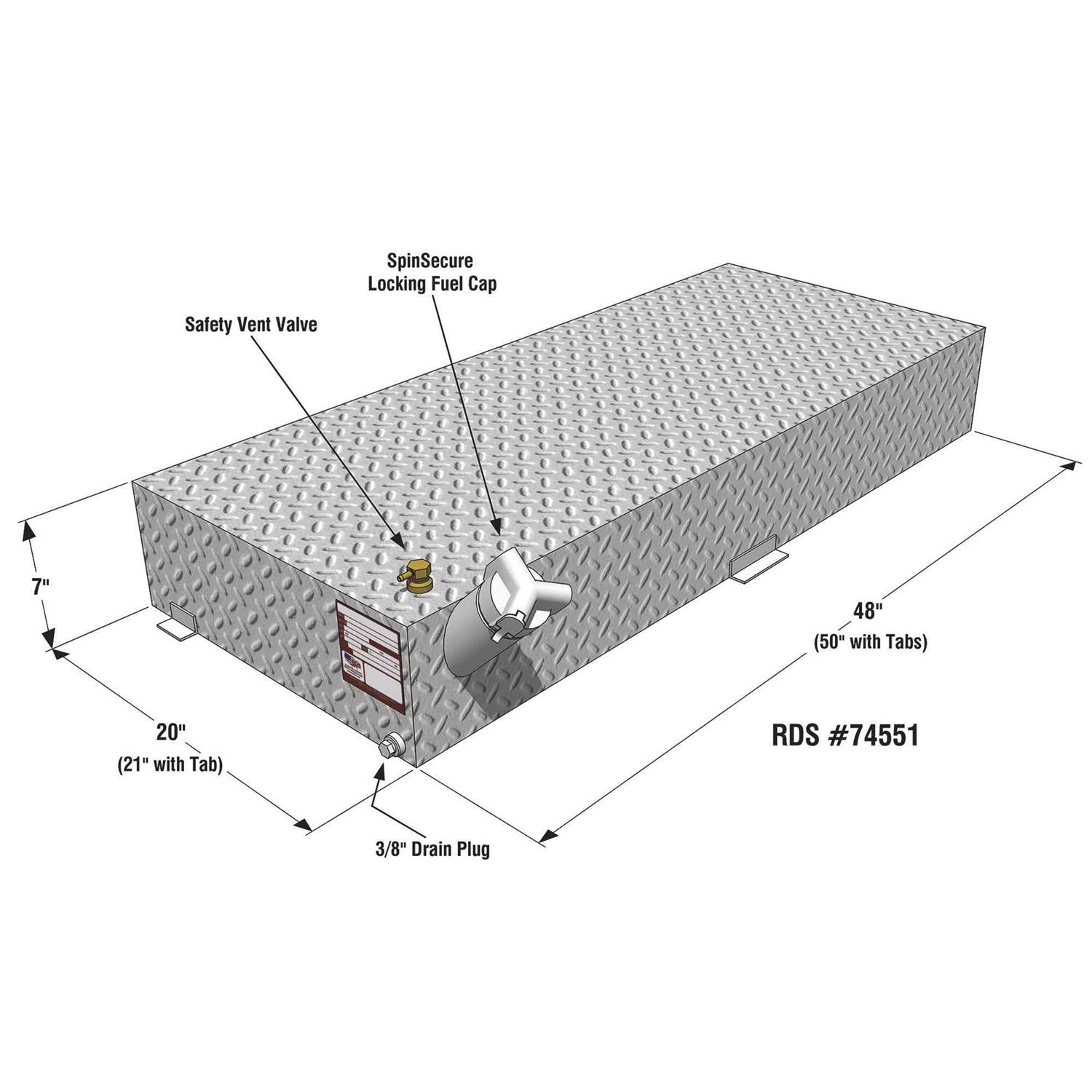 No more constant stopping when pulling a travel trailer or 5th wheel. Intended for highway use with diesel. Fits under a low profile toolbox. It is the user’s responsibility to comply with local, state and federal requirements pertaining to safe transportation, loading, and discharging of tank contents. U.S.A. Compatible With Diesel, DOT Approved Yes, Finish Type Diamond plate, Inlet Diameter in. 2, Material Type Aluminum, Mounting Hardware Included Yes, Outlet Diameter in. 3/8, Overall Dimensions L x W x H in. 50 x 21 x 7, Shape Rectangle, Tank Dimensions L x W x H in. 48 x 20 x 7, Tank Size gal. 20, UV Inhibitors No. Fits under a low profile toolbox Overall 50in.L x 21in.W x 7in.H 20-gallon capacity Vehicle rollover safety valve vent Front corner fill with lockable fuel cap Includes 3/8in. FPT drain plug Internal baffles to reduce sloshing Rustproof aluminum construction Heavy-gauge mounting tabs Tank made from heavy-duty 0.125-ga. aluminum Fully welded seams 100 pressure tested and submerged to test for leaks Not intended for use with gasoline Tank can be used to transport diesel Tank meets DOT standards Gravity feed diesel Model Number: 74551. Age Group: adult.