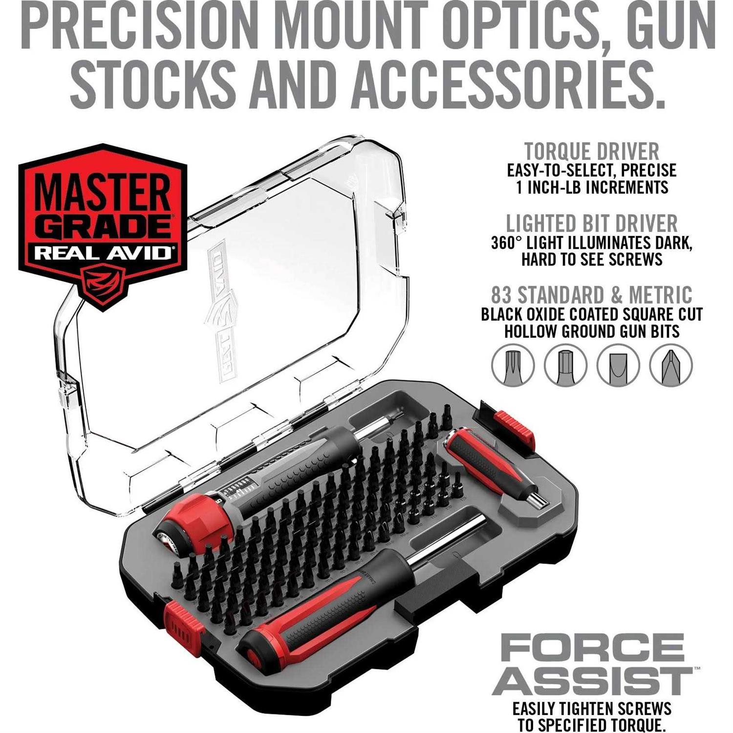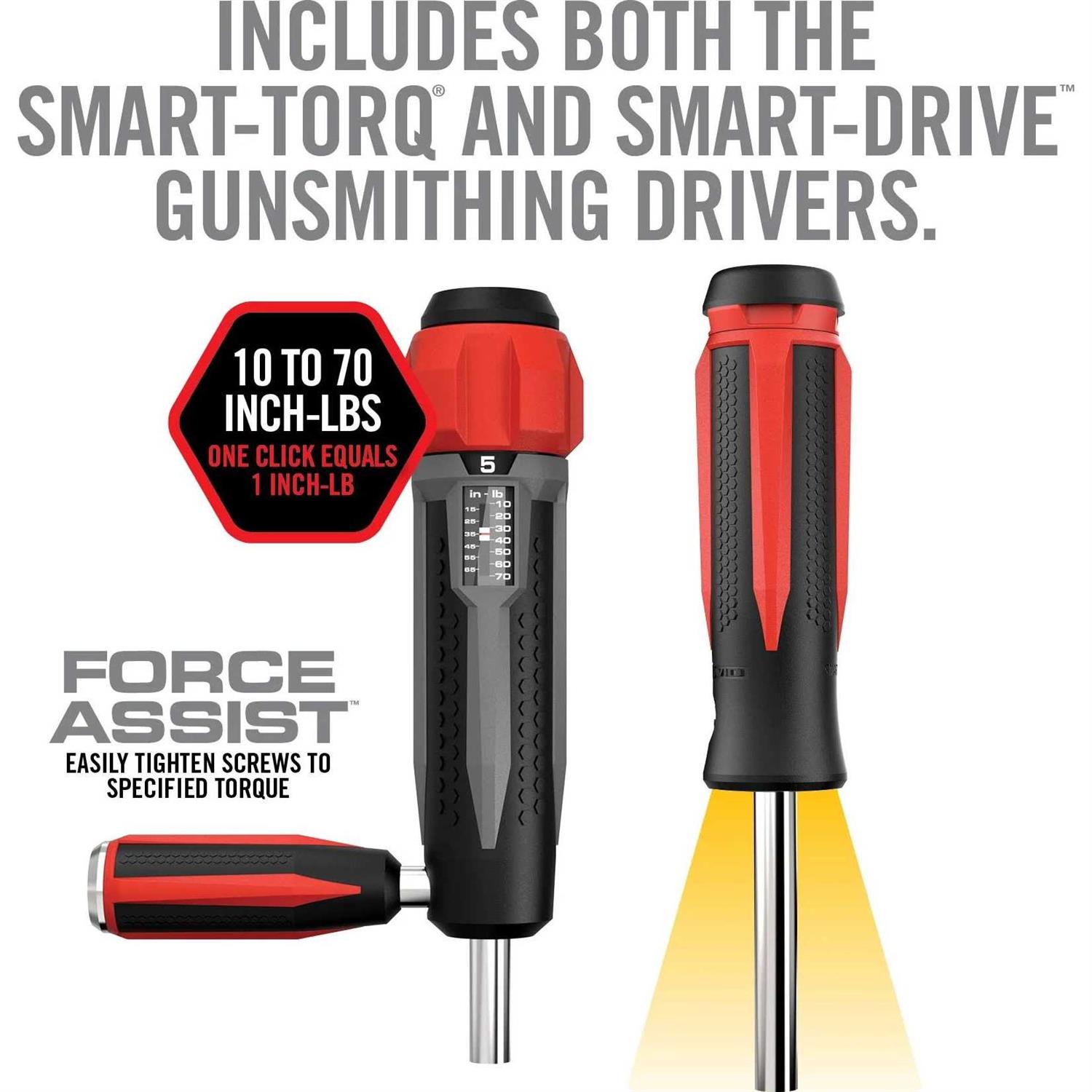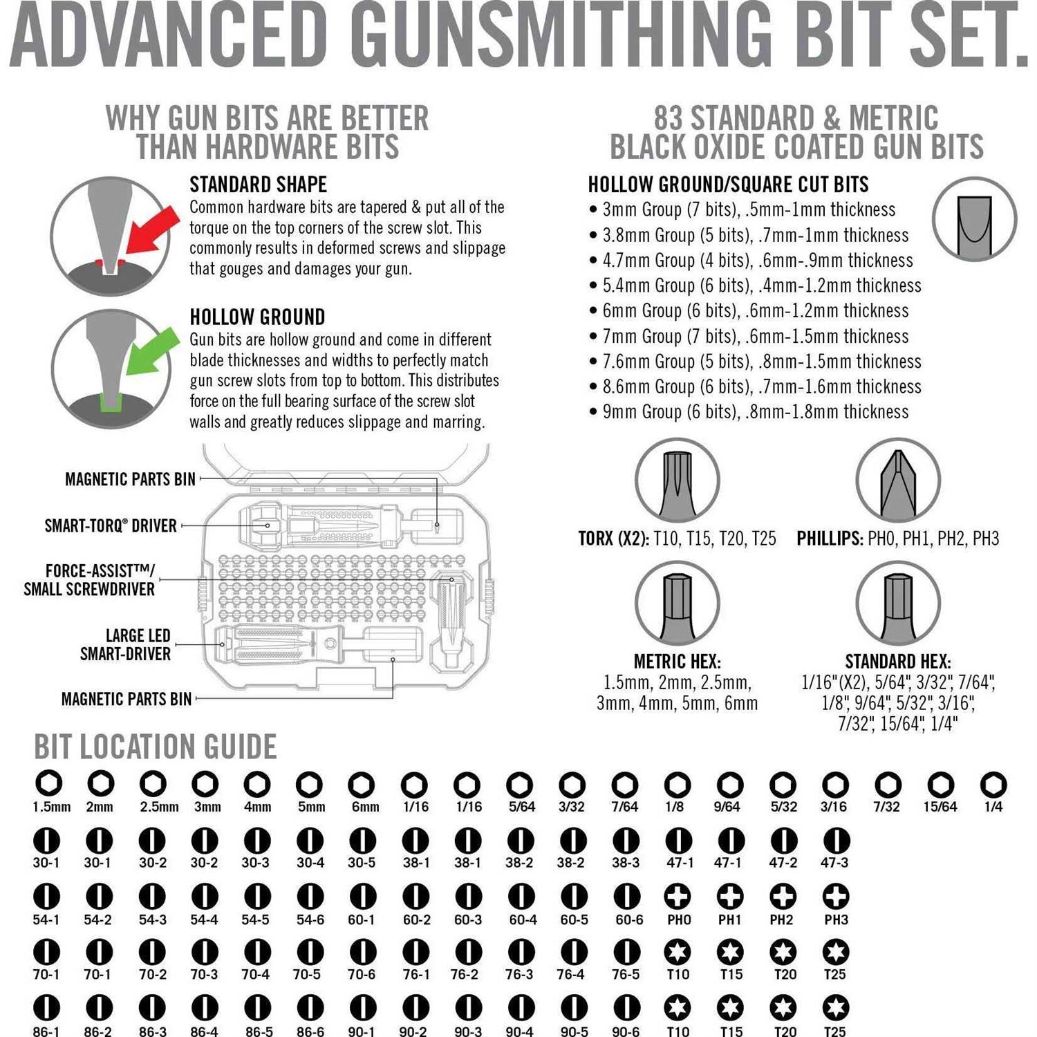 The Master Set includes both the Smart-Torq and Smart-Drive gunsmithing drivers. With ergonomic comfort grips, both drivers fully integrate with the multi-purpose Force Assist driver. Smart-Torq features easy to see and set in 1-lb increments. Smart-Drive has a free spinning cap for applying additional downward pressure and an LED light for dark spaces. Completing the set are 83 standard and metric black oxide coated gun bits. Gun bits are hollow ground and square cut for precise fitment.
