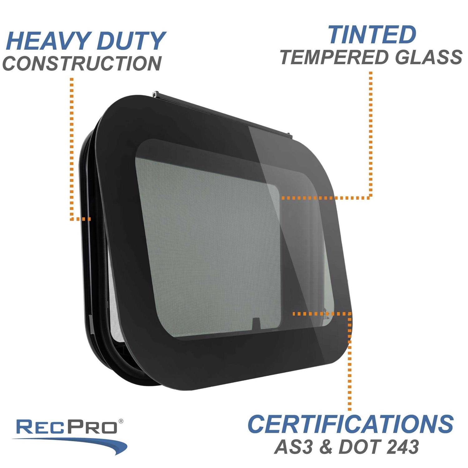 Windows are an essential part of RV interior and exterior design, RV function, and comfort. They add natural light and allow fresh air to flow through your RV interior. They go a long way in helping you customize your RV the way you want to as well. You can accessorize them with curtains, stickers, and other items, while also helping your rig feel more open and spacious. But what happens when you are building your own setup or your old windows have become damaged? When a stray ball finds its way into your window, you can find the replacement right here at Rec – This particular model of window is part of our frameless window line. As the term “”frameless window”” would imply, this model of 20″”x15″” window has no frame. It is designed to fit flush with the side of your RV, giving it a sleek appearance that enhances the exterior design of your rig with a clean and modern feel. – The housing of the window is made from sturdy and lightweight metal, giving the glass portion of the window a strong surface to rest on. Along the outer edge of the window is a strip of soft foam padding, which helps to seal up any gaps. This foam seal will help protect against leaks, bugs, and more. On the inner side of the window, you will find the easy-to-use twist handle that allows you to crack open the window to get some wonderful fresh air. – The glass is tempered and tinted to stand up to the test of time and stay in good condition for longer. The tint helps to increase your privacy as well as decrease heat gain from the sun. While you want to be able to see outside, you don’t want the outside to be able to see into your rig at all times. This window includes a trim kit and screws, which help to increase the durability and seal of the window and do not affect the frameless appearance of the window. Keep in mind, however, that this window is not designed for installation in the sidewall of the slide-out, the side that rubs against the RV when the slide is retracted. – Our window lines are designed to give you a high-quality RV window that works with your RV and style. With this clean and modern window, you can really let your rig shine. Details:Frameless RV Window – Rough opening: 19 5/8″” W x 14 5/8″” HOverall dimensions: 22″” W x 17″” H x 2 1/2″” DTrim Ring for 1 1/2 wall thickness – Corner radius: 3.125″”Made in America – Tinted glass – Heavy-duty construction – Relatively waterproof because of designTemperedInclude trim kit and screws (does not affect frameless appearance)Certifications:- AS3- DOT 243″
