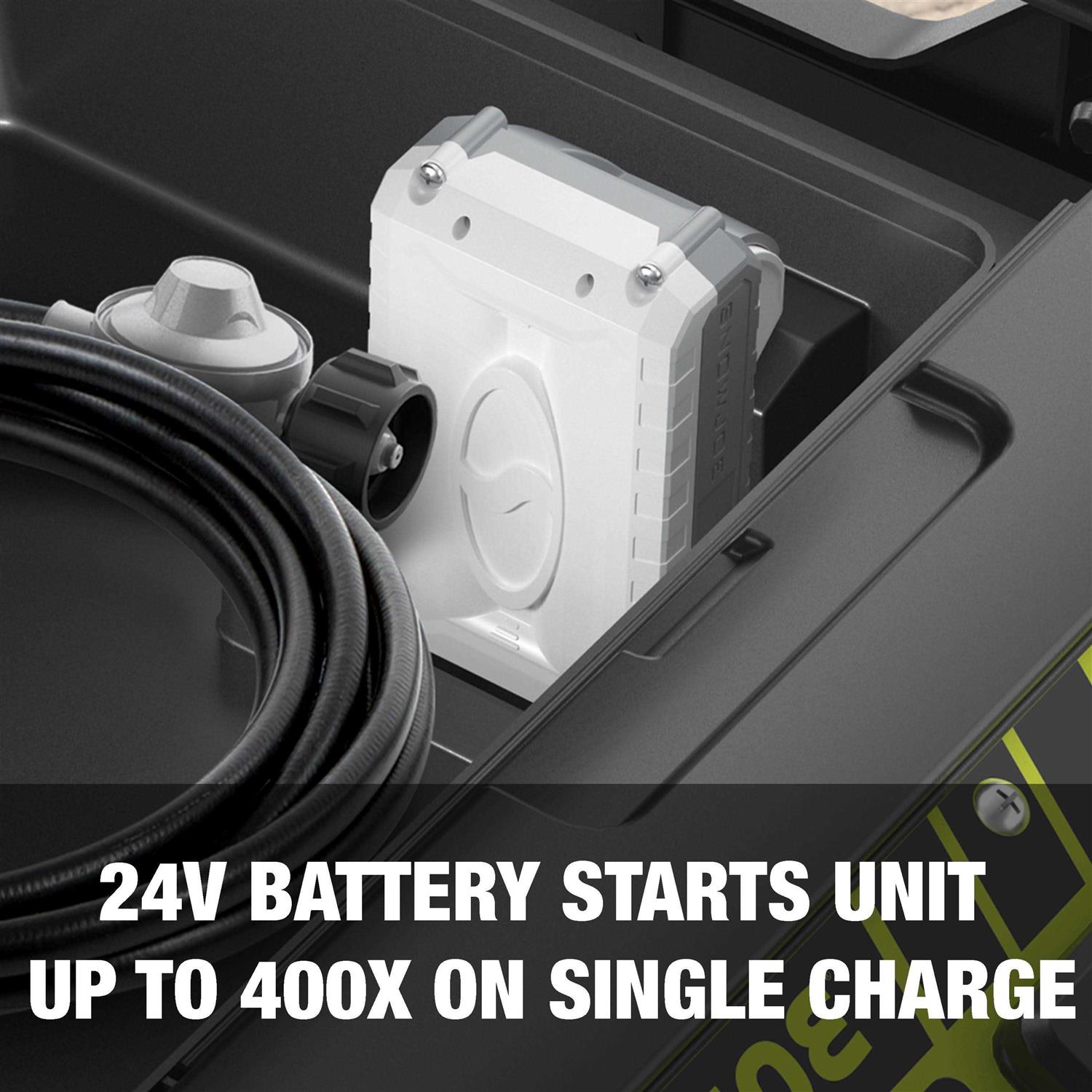 No electricity? No problem! This Sun Joe portable propane generator provides power when and where you need it. Run multiple items at the same time — from your refrigerator or microwave, to your lamps and lights, heaters, mobile devices, TVs, and more. A simple push button (powered by a removable 24V battery and charger cable that also work across the Sun/Snow Joe range of tools!) starts the propane gas-fueled engine. There’s even onboard storage for your tank (up to 25 lbs) and two wheels so you can easily transport the generator to your backyard, a campsite, tailgate, or any other outdoor area. With six outlets (including one for RVs), you can plug in multiple items at once, and there’s even a USB port for cell phones, tablets, and other electronic devices. A simple, low-maintenance solution to keep your household items running (and you always prepared), this generator provides peace of mind that next time there’s a power outage, you won’t be left in the dark. From Sun Joe .