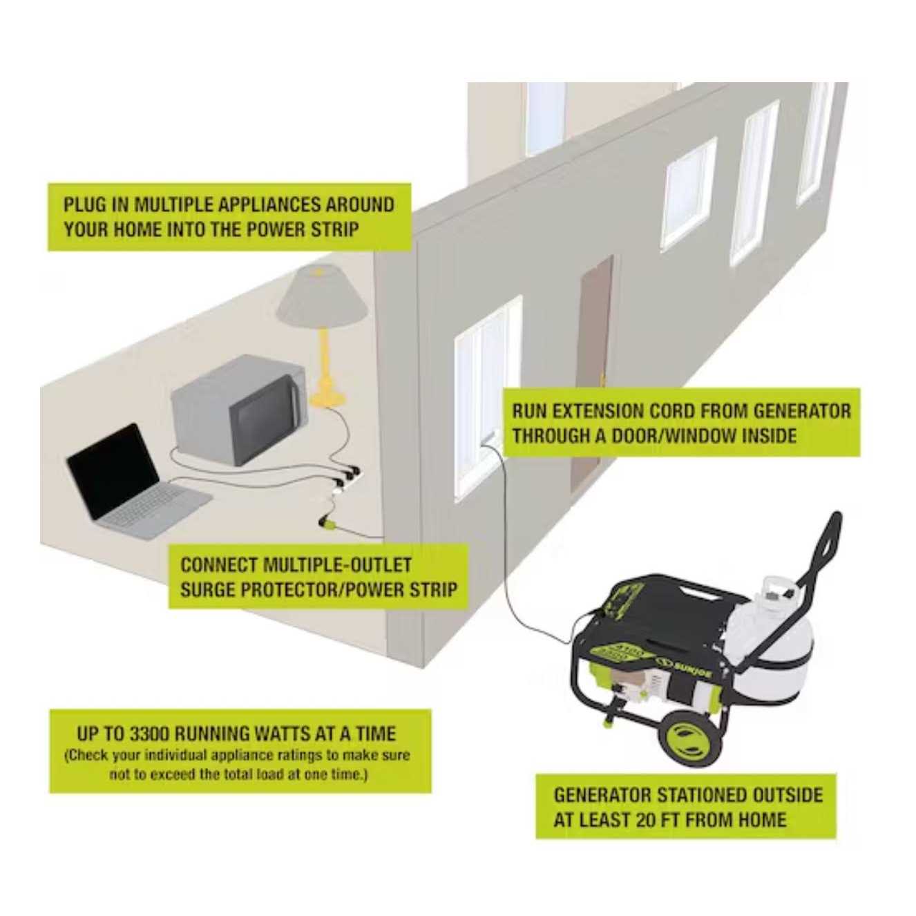 TOTAL VALUE: $1,350; includes Portable Propane Generator, Generator Cover, Extension Cord, Magnetic Dipstick, 2.0-Ah Battery, & Charger Features exclusive PRO POWER3X technology: PowerSTART, PowerCOOL, PowerFUEL Starts with an included 24-Volt 2.0 Ah lithium-ion battery — starts the unit up to 400 times on a single charge! 4100 Starting Watts/3300 Running Watts of power to run multiple appliances for up to 9 hours of continuous runtime on a 20 LB tank! Integrated control panel with multiple outlet options for your electronic devices, appliances, RVs + campers, and more. Included propane hose – siphon the fuel from the tank (propane tank not included) for continuous, cleaner energy. Collapsible transport handle and onboard tank storage to easily wheel around the home, RV, campground or worksite. Factory Authorized Remanufactured using original parts and trained service technicians. When you suddenly lose power, life stops. Keep the power on with your home’s hero: the Portable Propane Generator from Power Joe, by Sun Joe. No more struggling with bulky, smelly gas generators. If you can start your BBQ, you can turn on Power Joe — just press one button! In a blackout, Power Joe gives you instant, reliable access to exclusive PRO POWER3X technology: PowerSTART, PowerCOOL, and PowerFUEL. PowerSTART features a 24V IONMAX lithium-ion battery to instantly turn on the motor the first time, every time, with up to 4,100 watts of power. And the included battery powers over 100 tools in the 24V IONMAX cordless tool system! PowerCOOL ensures superior air flow with an enhanced fan design to keep the motor running cooler, stronger, and longer than traditional generators. And PowerFUEL harnesses the pure power of greener, cleaner propane to eliminate carbon build-up in the motor, and it’s virtually maintenance FREE! Get Equipped to power all your devices with multiple outlet options: two standard 120-volt outlets, USB-A and -C ports for all of your electronics, a twist-lock receptacle and an RV outlet for campers and campsites! Turn on lamps, plug in the fridge, run the microwave, turn on heaters or the AC, and keep your phones, tablets, and TVs on. When the power’s gone, Power Joe ON! Simply load a 20 LB propane tank into the onboard tank storage, connect the included 5 ft. propane hose, and get up to 9 hours of runtime with Power Joe! The 8 horse power, 4 stroke OHV engine is powered by propane, for less carbon build-up in the motor. Plus the handy features like the onboard LCD display + control panel, low-oil sensor with automatic shut-off, and dual circuit breakers make Power Joe a true powerhouse. So, keep your life running even when the electricity has stopped — and Go With Joe. Power quick, power easy, Power Joe. The Power Joe Portable Propane Generator, by Sun Joe. GET EQUIPPED.