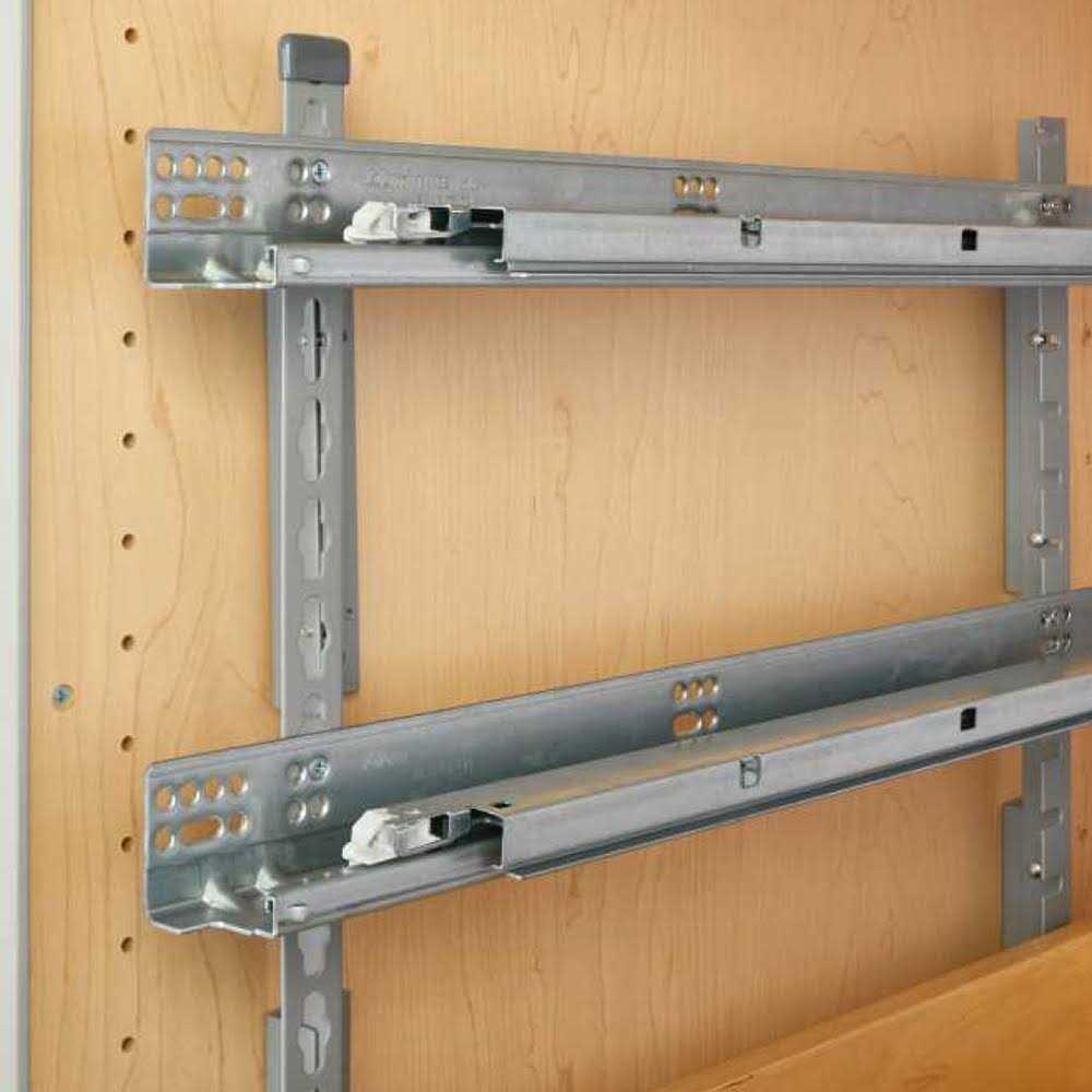 One thing is certain. Nothing in this world stays the same. So why would your storage needs be any different? That is why weve created an easy to customize pilaster system. The pilaster rails are adjustable to accommodate variable cabinet constructions and avoid hinge obstruction. Available a’ la carte or in kits with multiple short and tall drawer options, they are easy to adjust and are perfect for storing sundries, pots and pans, appliances qand more! For base and pantry applications Silver finish uprights (ONLY) Works with 4WDB4 and 4WDB7 pilaster drawers (Sold Separately) | Rev-A-Shelf- Base Cabinet Pullout Adjustable Shelf System Hardware By Rockler