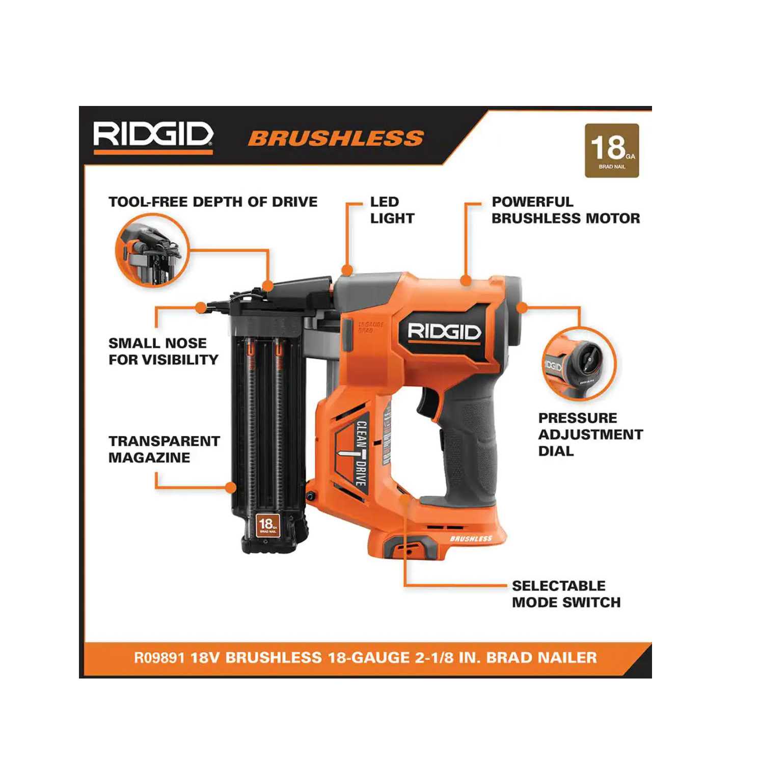 This 18V cordless brad nailer is more compact and lighter weight compared to the previous model (R09890B). Featuring CLEAN DRIVE Technology, this brad nailer boasts 17X more consecutive perfect drives than the competition. CLEAN DRIVE Technology means you can spend less time fixing and more time working. This brad nailer has a small nose for visibility, drives flush at all angles, and no driver blade slip. Paired with any RIDGID 18V battery, you get all the power of a pneumatic nailer in a cordless tool. With no compressor, no hose, and no gas cartridge, this cordless brad nailer enables faster set-up and easier maneuvering on the job site, driving 18-gauge nails from 5/8 in. to 2-1/8 in. The included battery and charger are compatible with all RIDGID 18V Tools. Best of all, this tool is 100% compatible with all RIDGID 18V batteries, and with registration, is backed by the Industry Leading Lifetime Service Agreement, providing FREE seals, FREE pistons, and FREE driver blades – For LIFE. Brad Nailer includes a belt clip, 2 non-marring pads, and operator’s manual.