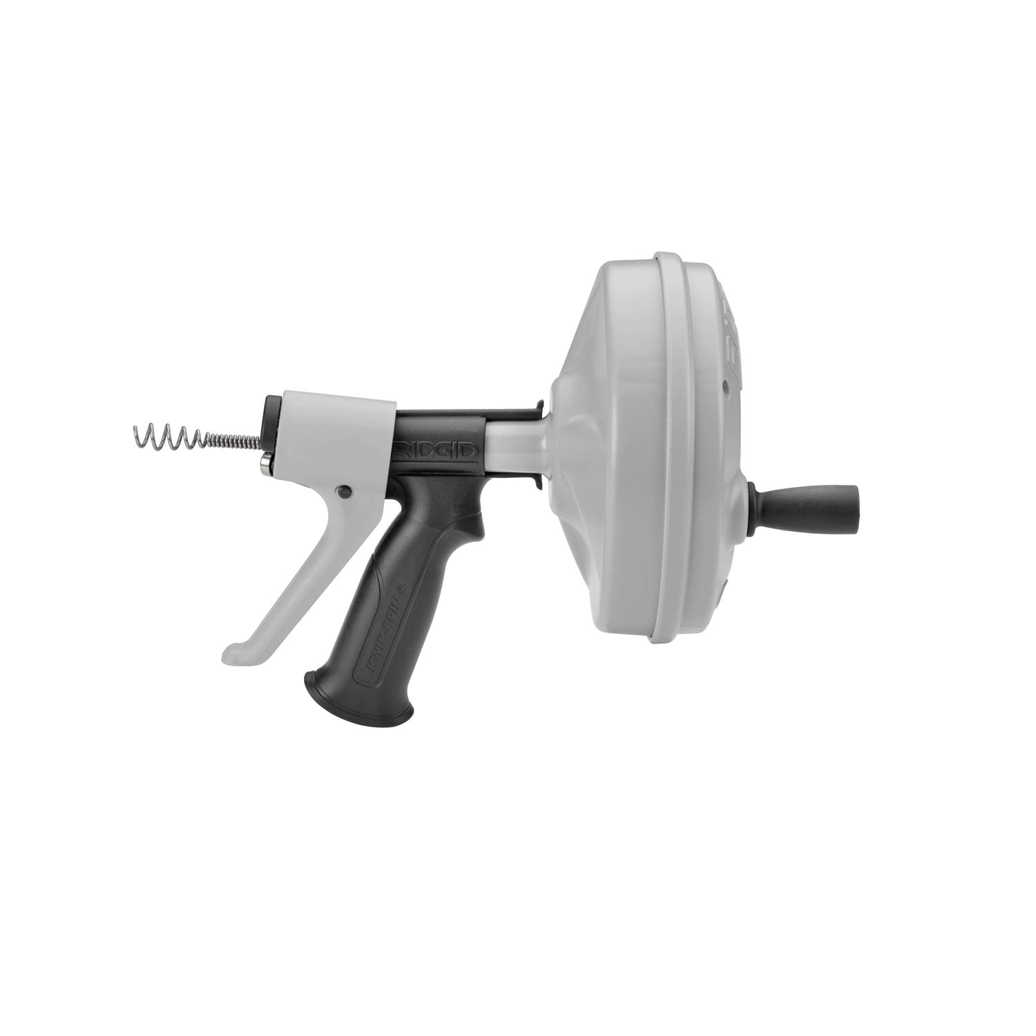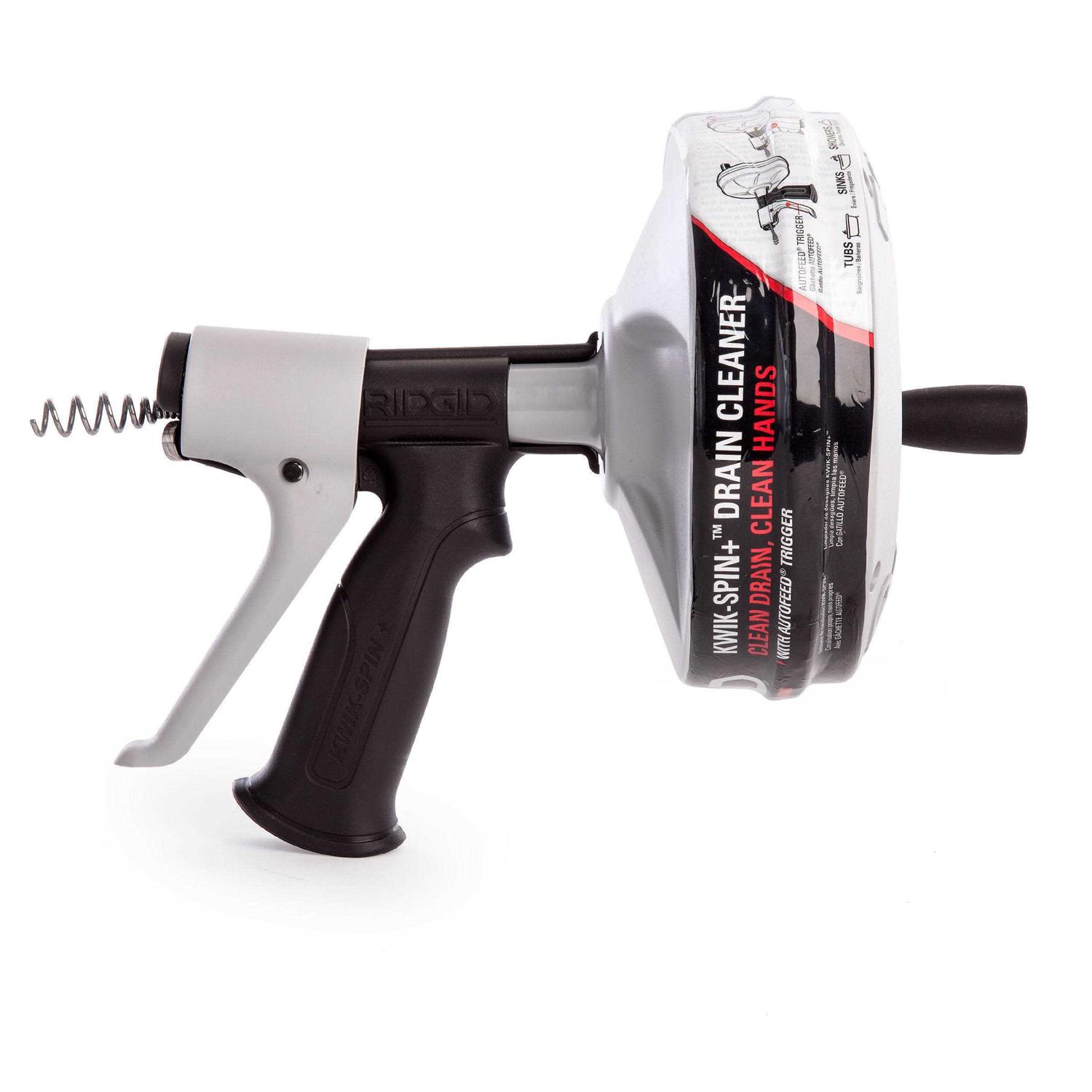 The new and improved Kwik-Spin+ from Ridgid is an excellent choice for cleaning purposes. The patented Autofeed trigger of this drain auger automatically feeds and retracts the cable as the drum turns. This Autofeed trigger of this Ridgid auger makes the job quick and simple. Get this drain cleaning tool that cleans drain lines from ” up to 1 ” in diameter. The cable is positively retained in the Ridgid drain cleaner drum to prevent cable pullout. A lightweight polyethylene construction of this sink clog cleaner will not dent or rust. Use this hand tool as a drain cleaner for small drain lines in showers, a plumbing drain cleaner, a sink drain cleaner, a bathtub drain unclogger, a drain opener, a drain unclogger, or a drain clog cleaner. Bid bye to a clogged drain sink with this plastic drum auger.