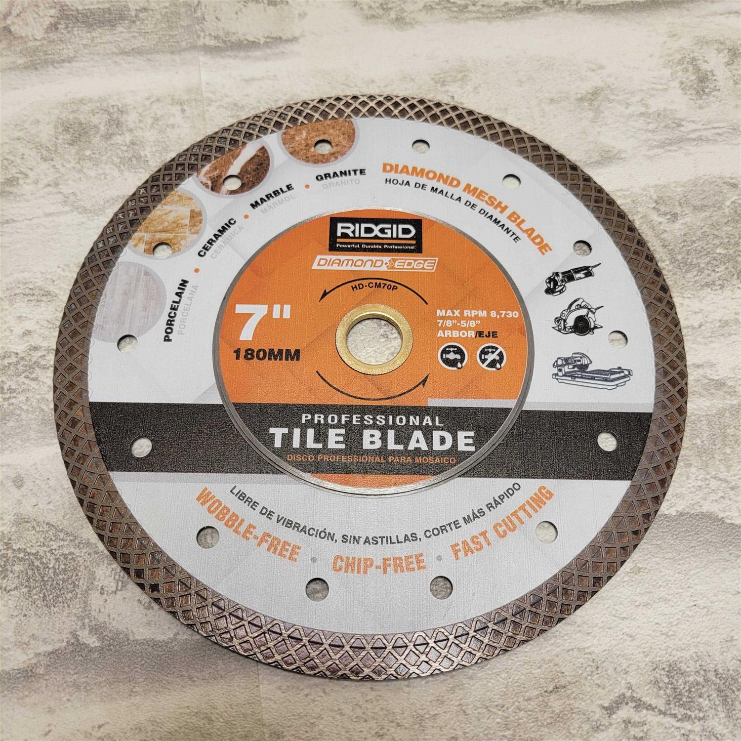 RIDGID Turbo-Mesh Rim Diamond Blades are made with the professional users in mind. These blades are engineered to provide an extremely smooth cutting finish on porcelain, marble and granite. The Mesh Rim design allows for less friction and more efficient heat dispersion for superior cutting performance. It has a reinforced hub steel core construction that ensures a wobble-free cutting experience. Use this blade on 7in. wet tile saws with 5/8in arbor.