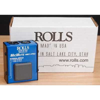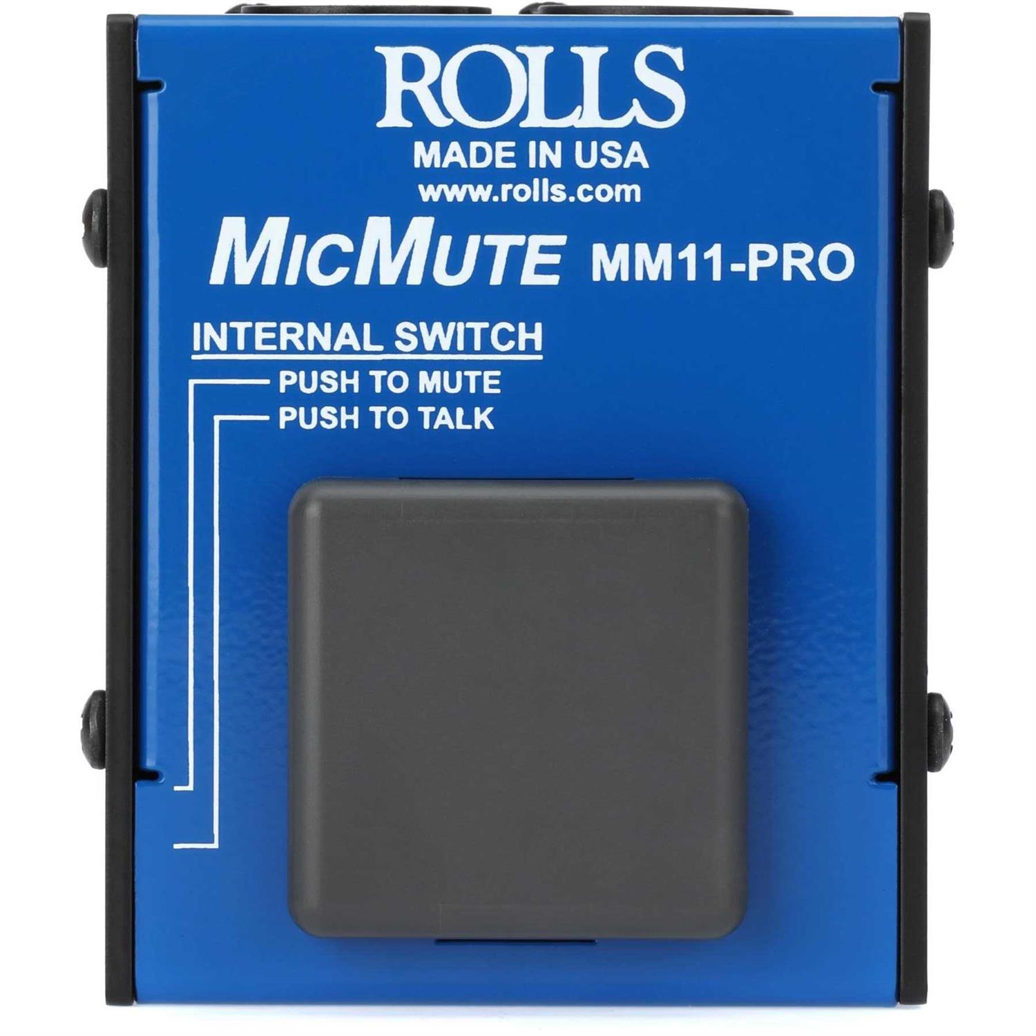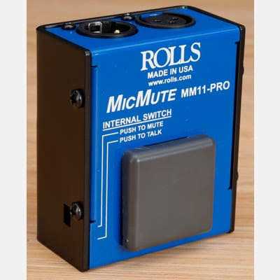 Switchable push to talk or push to mute function Passes Phantom Power Lowers the mic signal about 60 dB The Rolls Pro Switchable Microphone Mute/Talk Professional Microphone Switch is a simple device designed to temporarily mute or talk a balanced XLR signal. This switch features a push-to-talk or push-to-mute switch. The MM11 Pro passes phantom power, with no popping on the outputs when switched. The switch can be simply pressed for muting (or talking) and released to hear the signal again (or to mute). This function is very handy in the event of a sneeze, cough, or other possible distracting noise, or even when the microphone is active. It has a large actuator switch, which may be used by hand or on the floor with your foot.