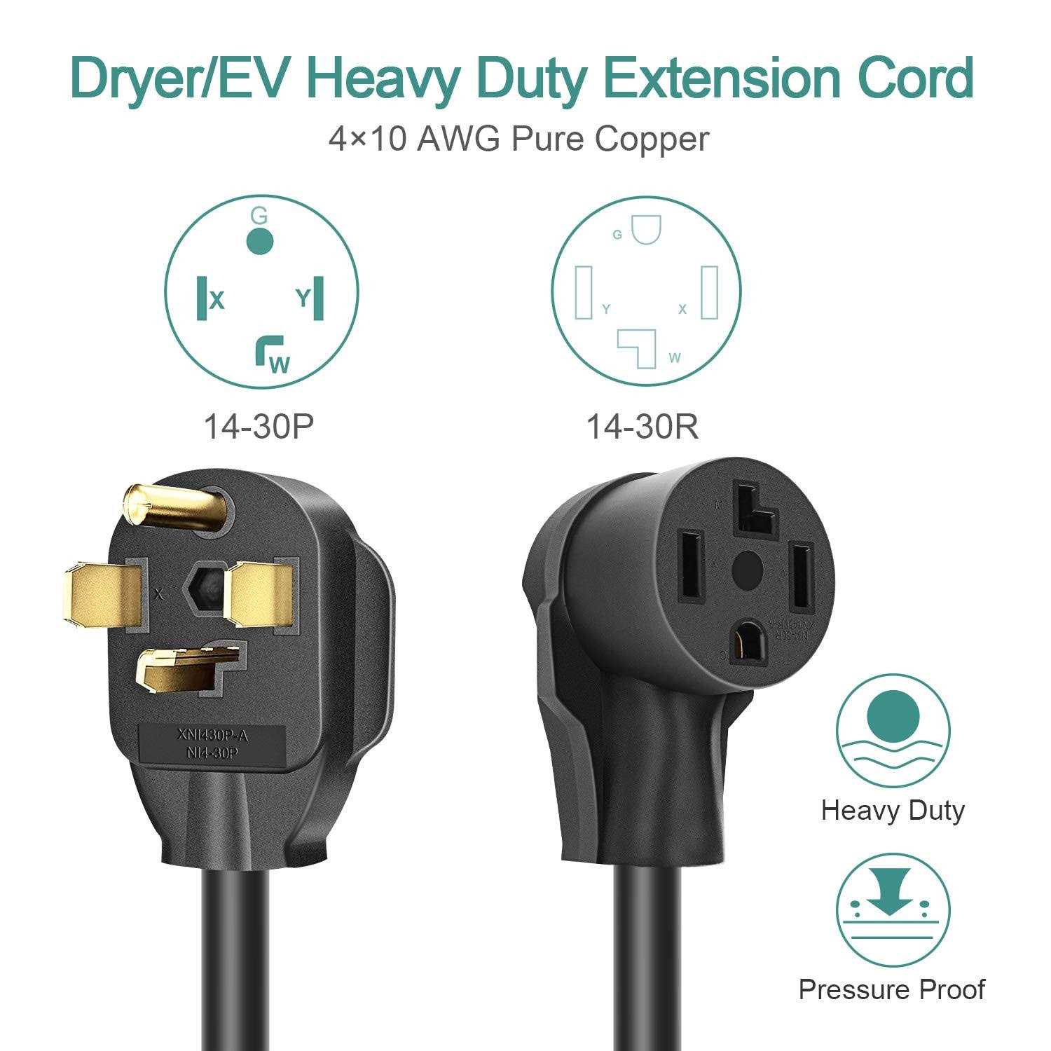 【Dryer & EV Power Extension Cord】: Used to charge your electrical vehicle, relocate your dryer and for other 220 Volt appliances. Make your dryer or electrical vehicle have more moving space for added convenience and flexibility. No need to hire an electrician to install a new outlet or EV wall charger. 【SAFETY ASSURANCE】: 10 AWG 4 Conducor heavy duty cord made of copper with PVC in UL 62 standard for heat-proof insulation and antioxidants, and plug in UL 817 standard support. 【HIGHT QUALITY MATERIAL】: 600Volt thermoplastic STW Jacket and 10 AWG (American wire gauge) x 4C all-copper wires with 14-30 NEMA plug, features excellent abrasion, oil and moisture resistance and flexibility. It should last for a long time even with rugged use. 【Produc Specification】: 30A, 125/250V, max wattage 7500 watts, 50 feet,STW power cord with 14-30P male plug and 14-30R female receptacle. UL/cUL approved. 【Why Choose Us】: Rophor specializes in the production of various adapter power cords. 100% of the products have been rigorously tested to ensure that each product received by our user can work perfectly. Important Note: /b br The plug of the dryer extension cord is 4 prong NEMA 14-30P, and the socket is NEMA14-30R. Please refer to the picture carefully.