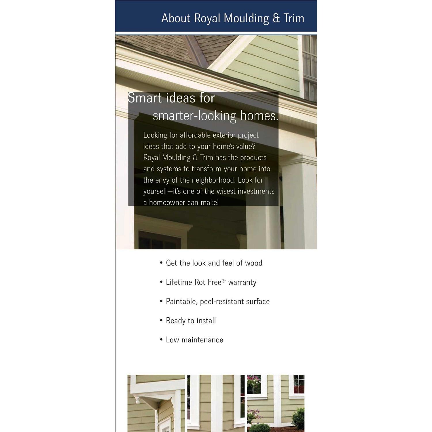 Royal PVC Trim Boards do way more than decorate. They insulate, protect and turn front porches into a center of neighborhood activity. They ramp up the curb appeal of any window, eave or doorway. Whether in a bathroom, basement, or garage, they are a stylish worry free alternative to wood anywhere moisture is a concern. Inside or outside your home, the decision to use Royal PVC Trim Boards is easy. Knot and defect free means no waste, and the smooth consistent white surface saves time and labor as it ready to install. Want to add color? Royal PVC mouldings can be painted with 100% acrylic paint or stained when properly primed. Used in your home or out, the lifetime never rot, moisture and termite proof material will give you peace of mind for as long as you are in your home. Your summer weekends are saved from painting and maintenance.