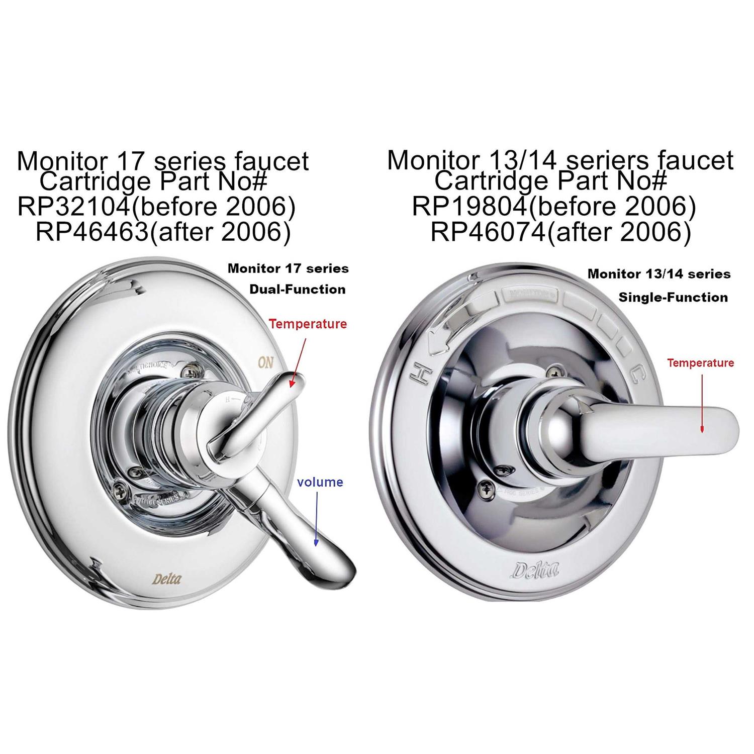 RP46463 Cartridge Replacement For Delta Monitor 17 Series (2006-Present) Shower Faucet Valve RP46073 Seat and Spring Adapter included RP46463 cartridge has a GREY cap and is for Monitor 17 dual-function shower faucets made after 2006 NOT for single-function Monitor 13/14 series faucet The screw on the old adapter design is not necessary. It could cause leakage and affect the smoothness If your shower was made before 2006, the right part should be RP32104(WHITE Cap) RP46073 Seat and Spring Adapter included. Manufactured by iyax. RP46463 cartridge has a GREY cap and is for Monitor 17 dual-function shower faucets made after 2006. NOT for single-function Monitor 13/14 series faucet. The screw on the old adapter design is not necessary. It could cause leakage and affect the smoothness. If your shower was made before 2006, the right part should be RP32104(WHITE Cap). Manufactured by iyax.