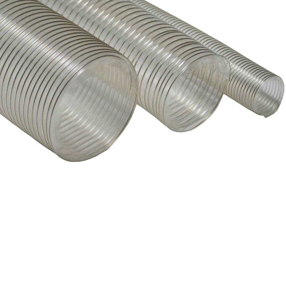 The PVC Flexduct General Purpose Clear is a versatile and affordable ducting hose, designed to provide a cost-effective option for a vast array of ducting needs. This flexduct is made from a clear PVC material, providing a solid hose which has a high range of flexibility. The PVC material is sturdy and allows the hose to keep its shape, it also has a steel wire helix winding through the body to add an extra level of reinforcement. Its high bend radius allows it to twist and contort into tight spaces to provide effective air movement, even in small or unusual settings. The General Purpose Flexduct can meet your ducting needs, even if it is exposed to moisture and chemicals. Its PVC body lends a moderate level of resistance to these substances, allowing the hose to provide effective air and dust transfer, even when it comes into contact with them. This flexible hose can also operate comfortably in temperatures of 20°F to 160°F and is highly compressible. It comes in standard lengths of 12 ft. and 25 ft. when fully stretched, but can be compressed down to a fraction of that size making it extremely easy to transport and store. Clear hose walls allows you to quickly and easily identify and remove blockages, making sure that minor issues do not derail your project. They come in a range of inner diameter sizes to suit a large number of requirements, starting at a 1 in. I.D. size and ranging up to 12 in.